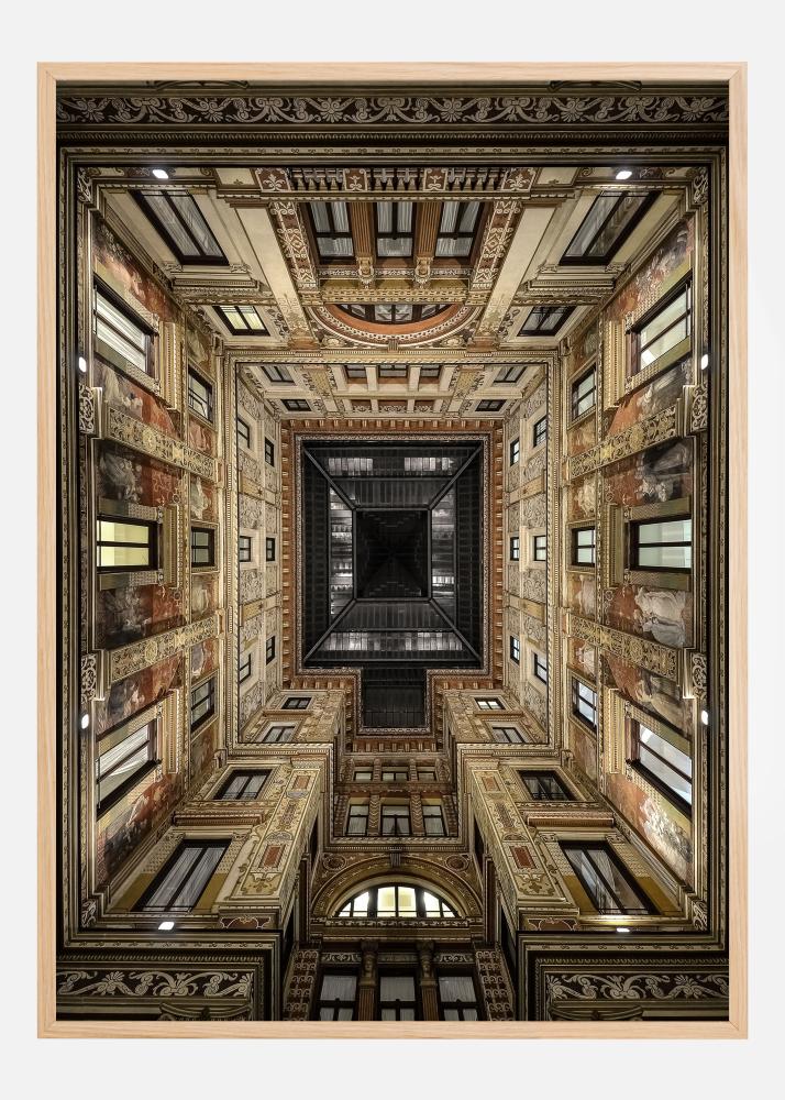 Un poster de interior cu Galleria Sciarra și arhitectura sa fantastică. Imaginează-ți că ești în clădire, privind în sus spre tavan și văzând minunata varietate de ferestre și modele complicate. Ia această călătorie cu tine acasă.