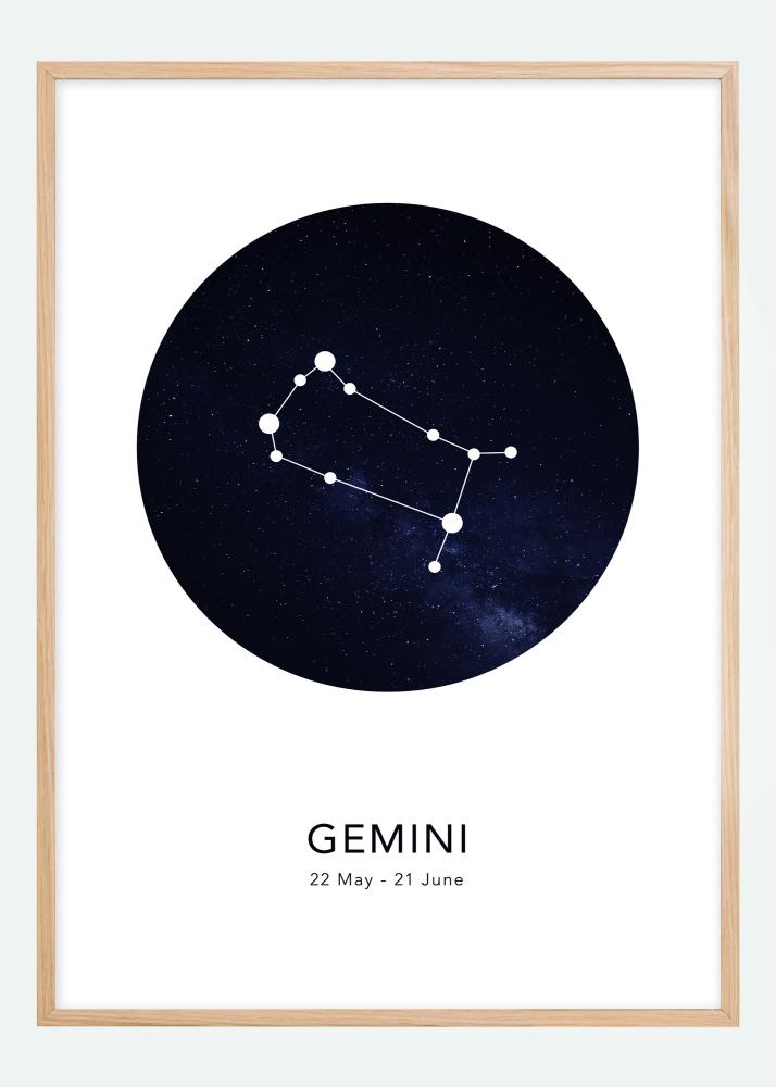 Oferă un tablou personalizat cuiva drag! Acest poster elegant are ca motiv semnul zodiacal Gemeni pe un fundal sub forma unui cer înstelat negru și albastru. Mai jos se află numele împreună cu datele corespunzătoare în limba engleză.