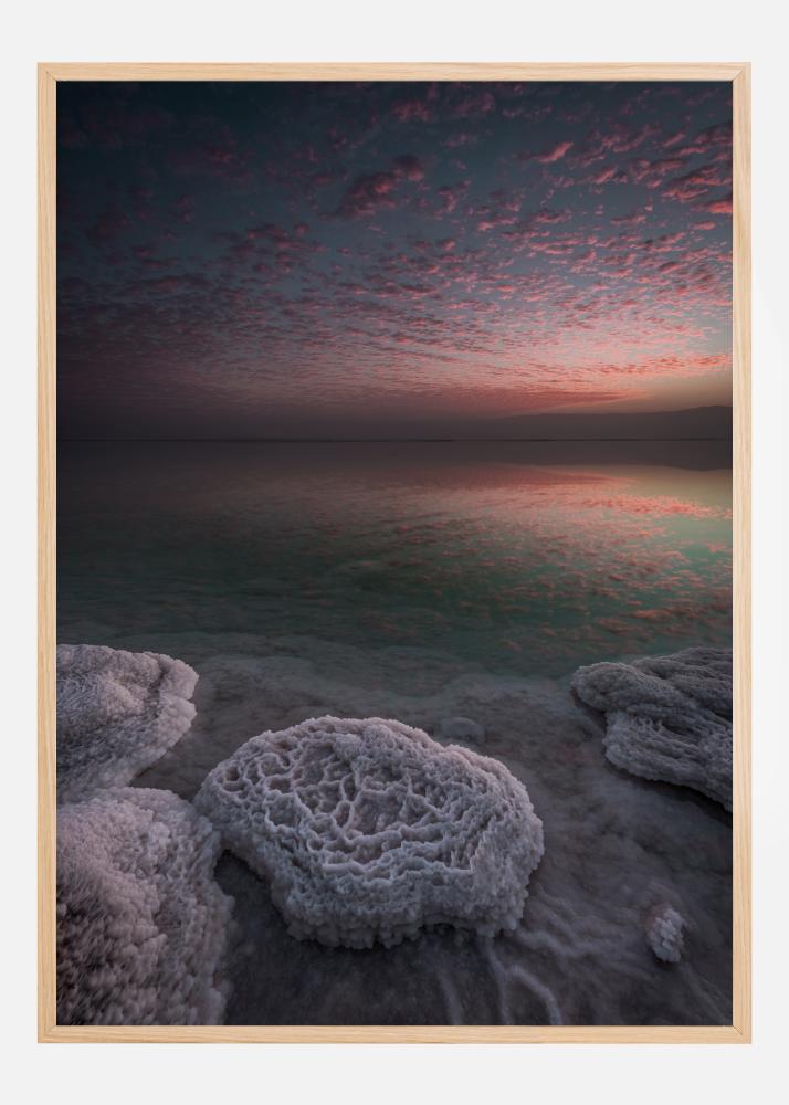 Un poster frumos cu un lac întins. În prim-plan s-au format cristale mari de sare care creează modele naturale fantastice. Lacul se întinde spre orizont, în timp ce un cer de noapte roșu și albastru dramatic contribuie la senzația magică din această imagine.