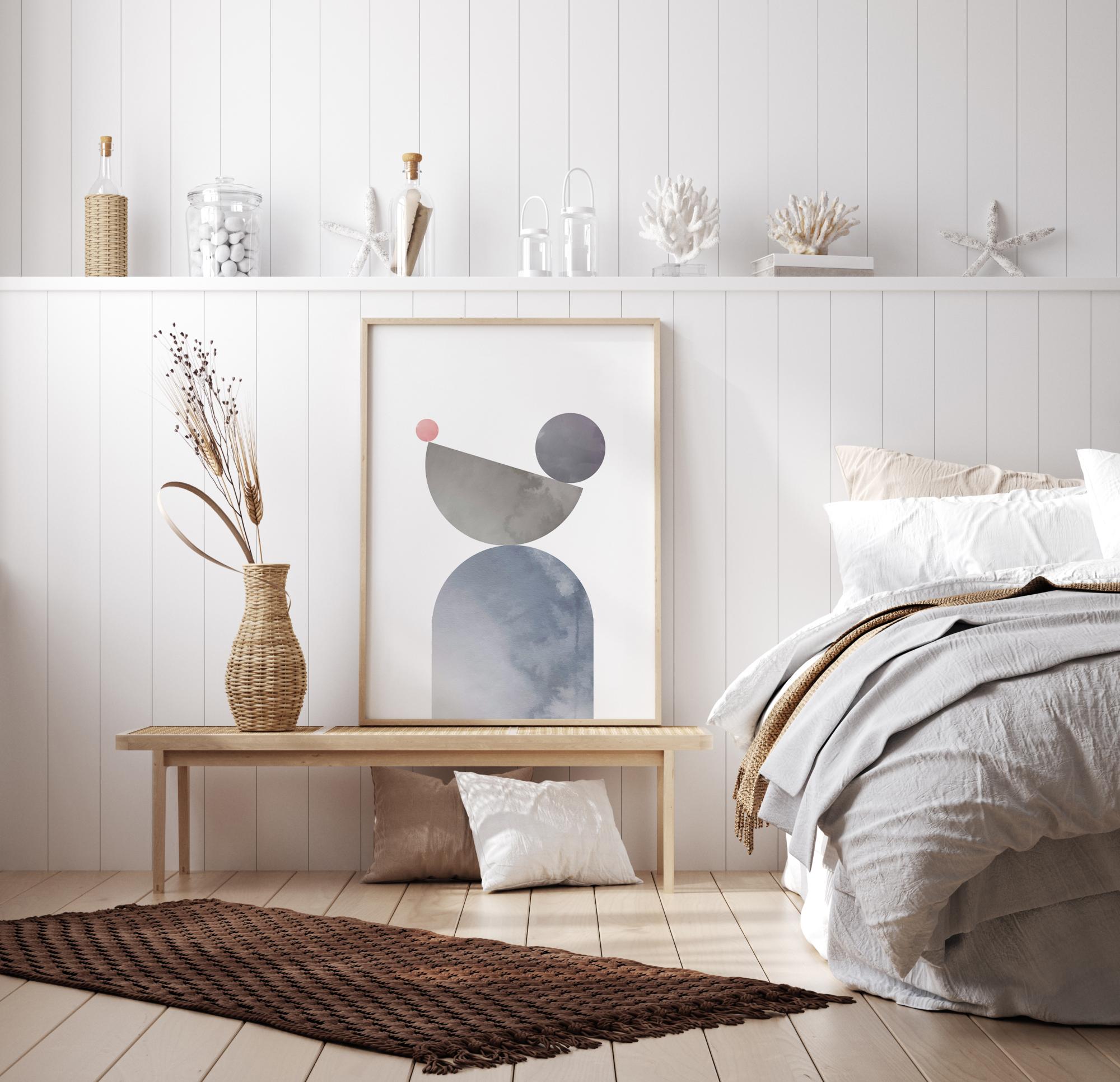 Un poster abstract cu forme geometrice și cercuri. O formă mare albastră, plină de nori, se află în partea de jos. În partea de sus, echilibrează un semicerc gri cu un cerc mic roz la un capăt și un cerc mare albastru la celălalt. Poți sta ore în șir și să fii fascinat de echilibrul din această imagine.