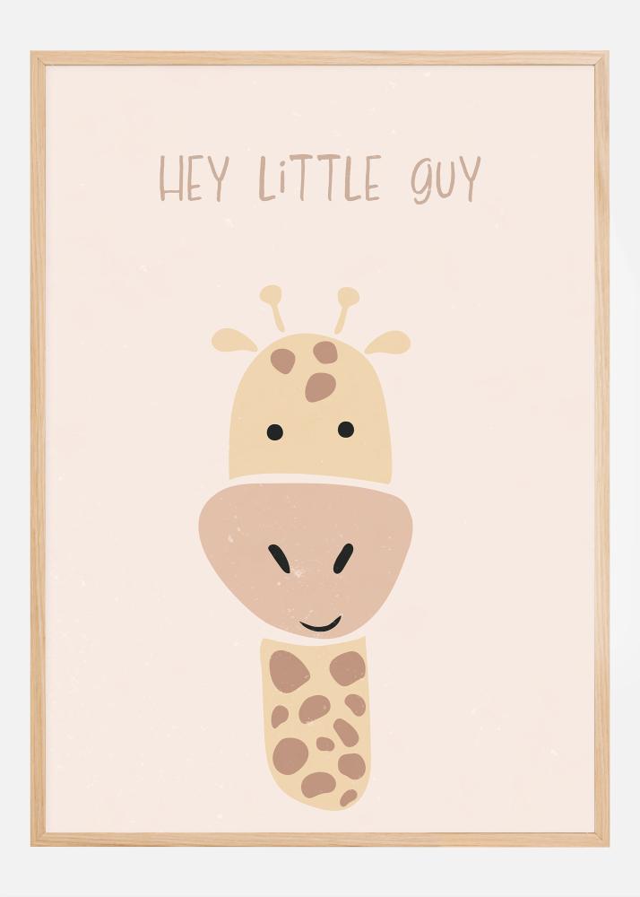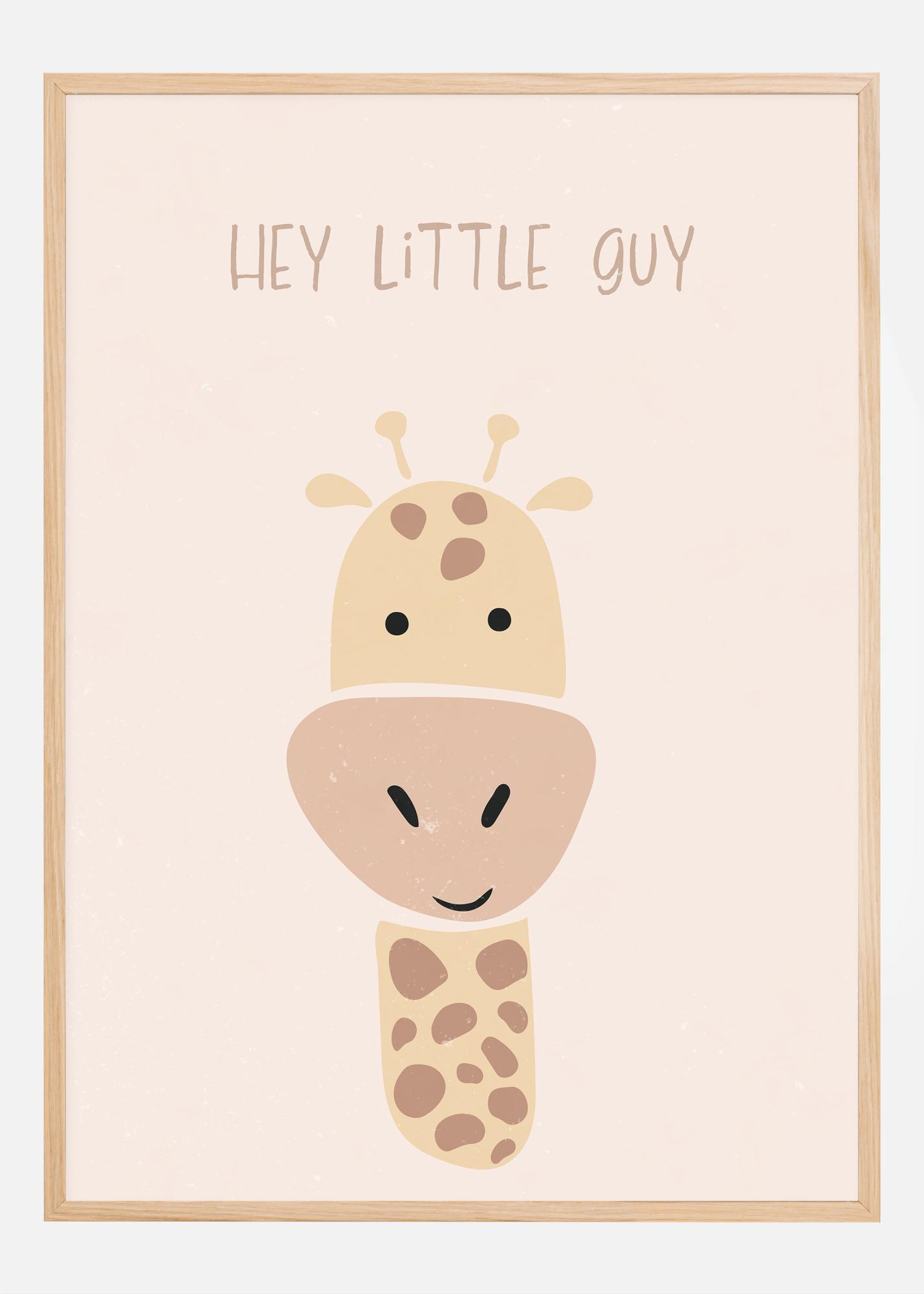 Această poster captivant cu textul "HEY LITTLE GUY" și o ilustrație a unui pui de girafă este decorul perfect de perete pentru o cameră de copii sau pentru un punct de interes jucăuș într-o altă cameră luminoasă. Motivul se remarcă prin culori blânde, cum ar fi rozul pal pe fundal și tonuri calde de bej și maro în desenul girafei. Girafa desenată, cu un design simplu și prietenos pentru copii, poartă un zâmbet larg și ochi prietenoși, creând o conexiune imediată și contribuind la o atmosferă veselă și primitoare.