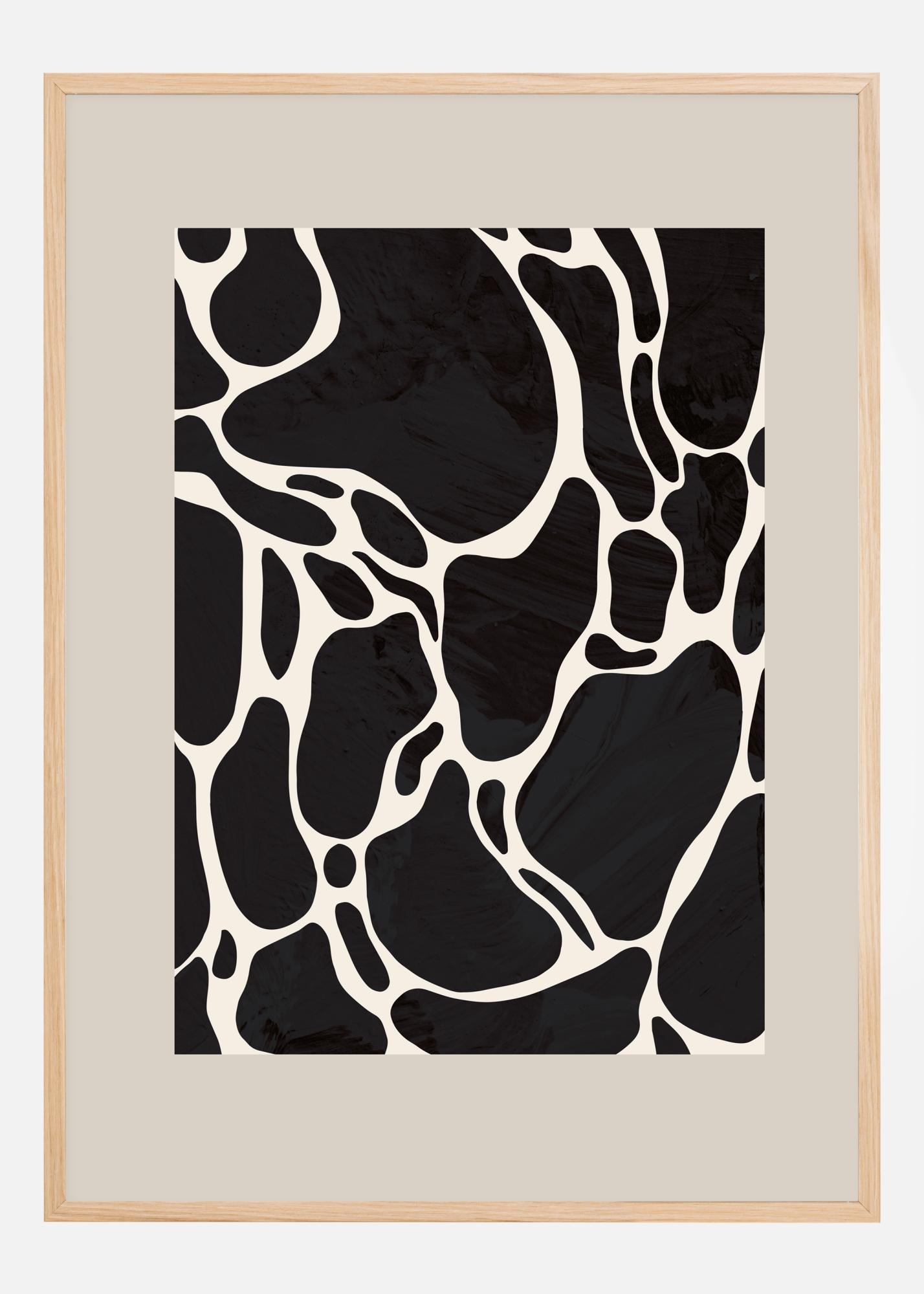 Un poster grafic cu pete de girafă în alb și negru. Blocurile mari de culoare în negru creează o imagine atrăgătoare, în timp ce loviturile de pensulă din ele oferă textură suplimentară. Liniile groase albe taie prin petele girafei și creează flux și mișcare în imagine.