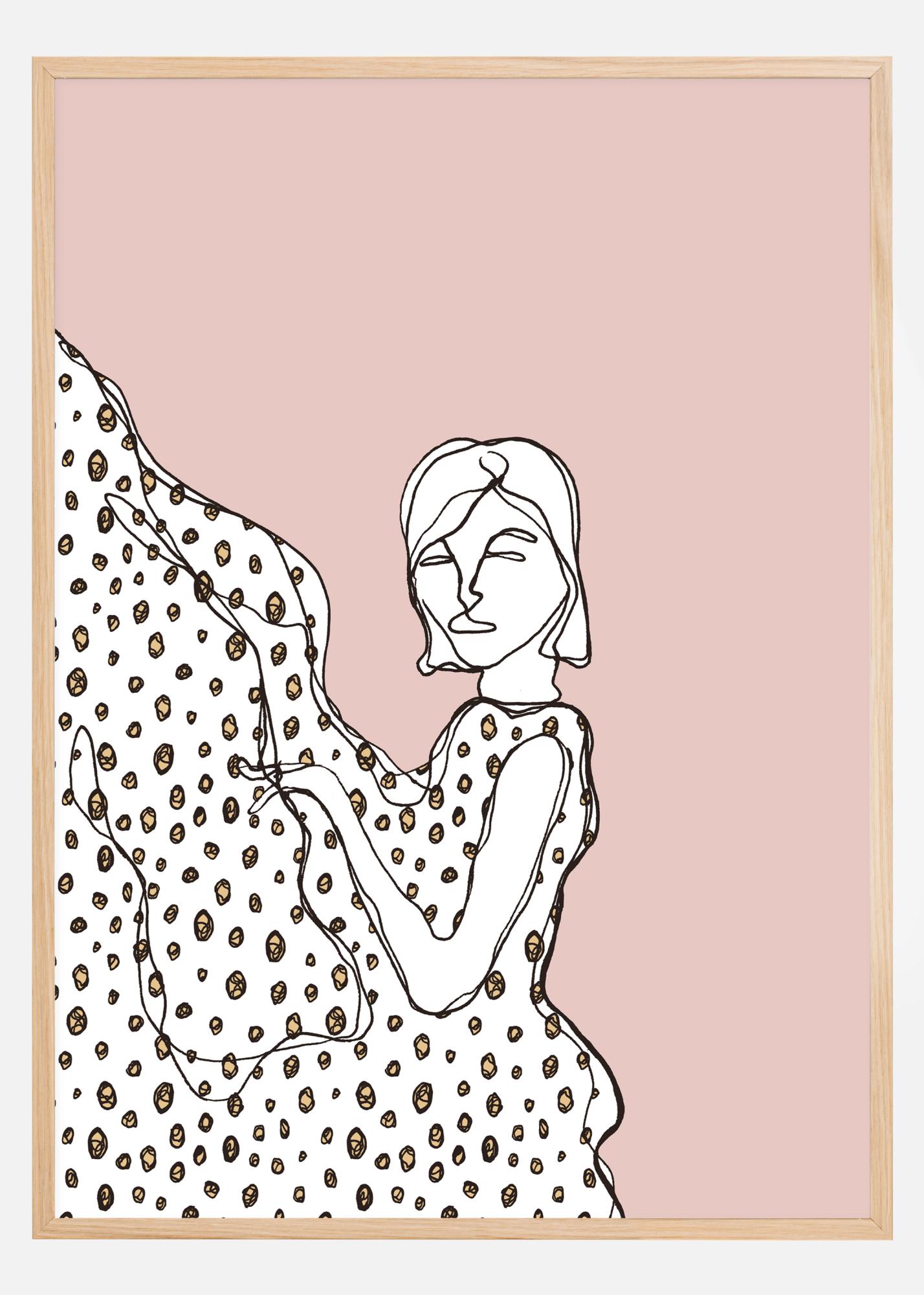 Un poster simplu cu o fată schițată într-o rochie cu buline. Schița brută a fetei creează mișcare când își învârte rochia în sus. Bulinele simple ies în evidență pe fundalul pastelat roz pal în fața căruia stă. Prinde-i privirea când se uită la tine.