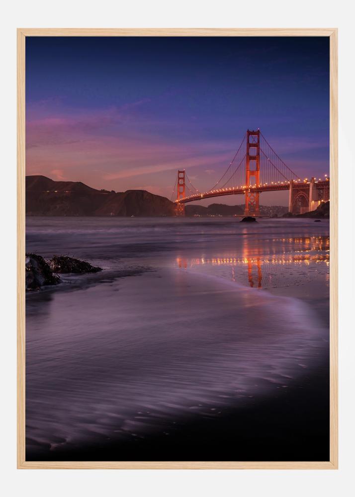 Un poster de noapte cu Golden Gate Bridge. Lămpile aurii luminează acest pod faimos și se reflectă în apa de dedesubt. O parte a plajei este în prim-plan, apa călăuzind privirea către pod și către cerul fantastic albastru și auriu unde apune soarele. Cufundă-te în această imagine de noapte uimitoare.