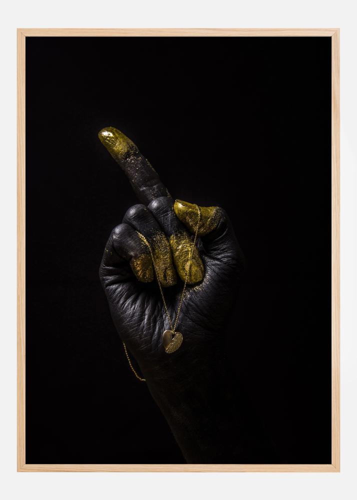 Un poster dramatic cu o mână neagră cu degete aurii care indică spre stânga. Pumnul închis folosește degetul arătător pentru a indica ceva ce nu putem vedea. În jurul mâinii atârnă un medalion auriu care cade elegant peste degetele de culoare aurie. Agățați acest poster pe un perete alb sau crem pentru un impact puternic.