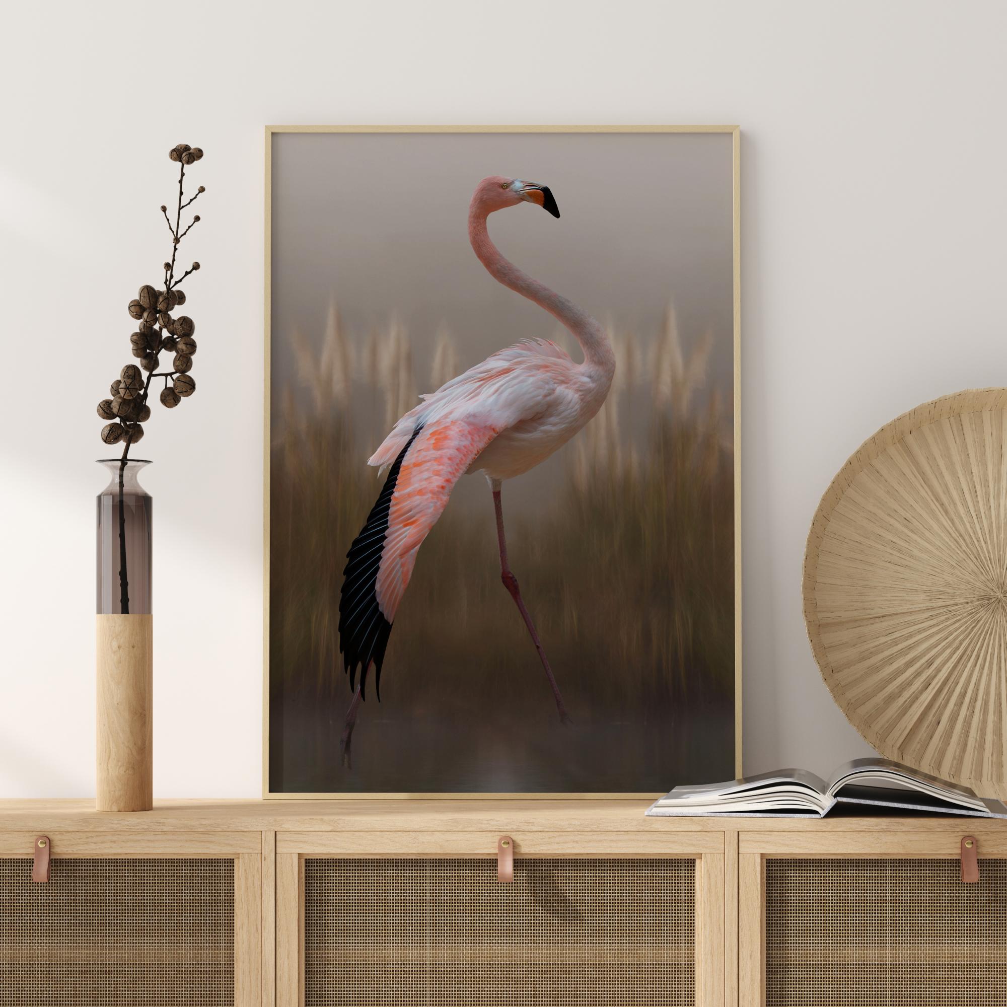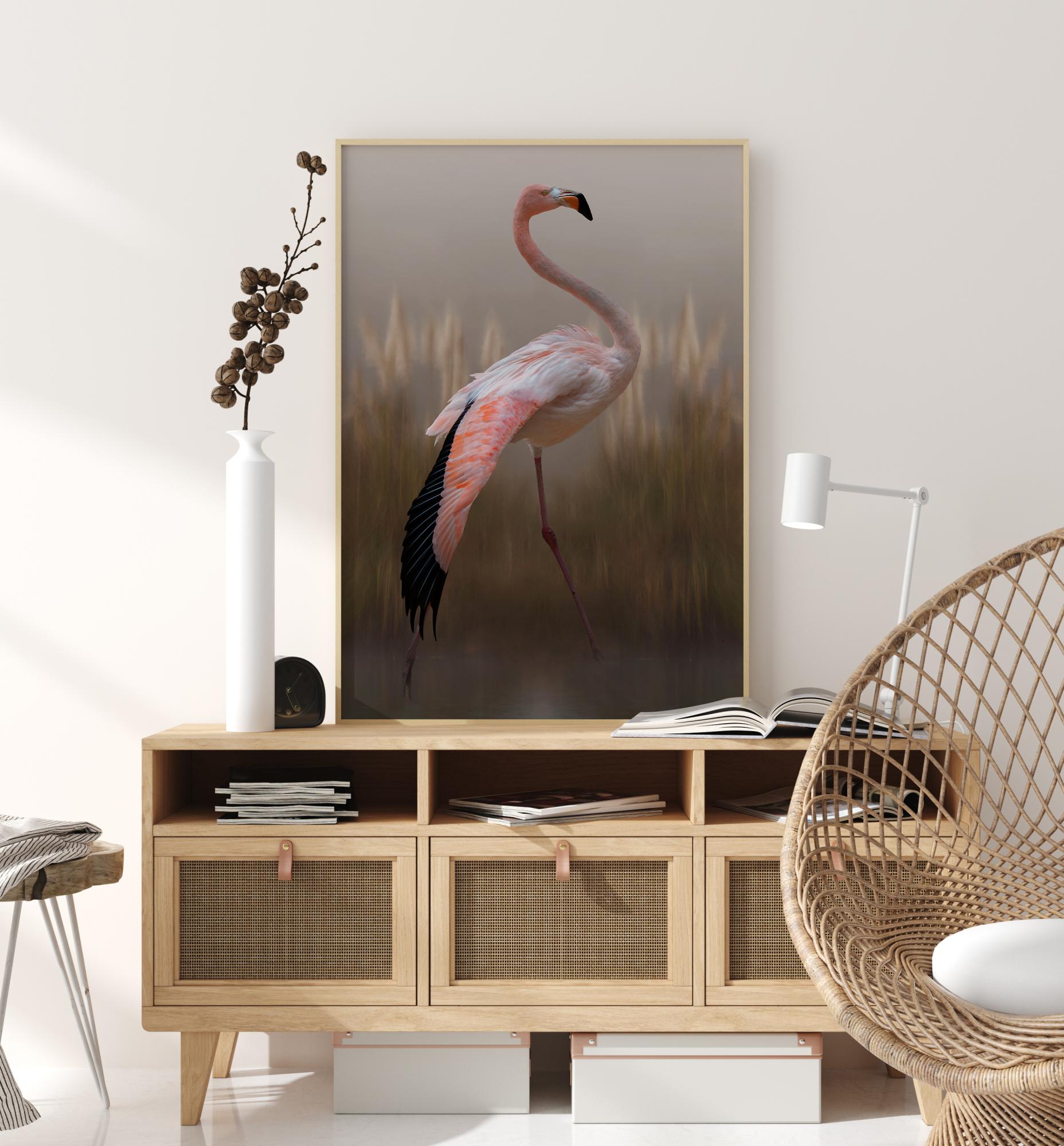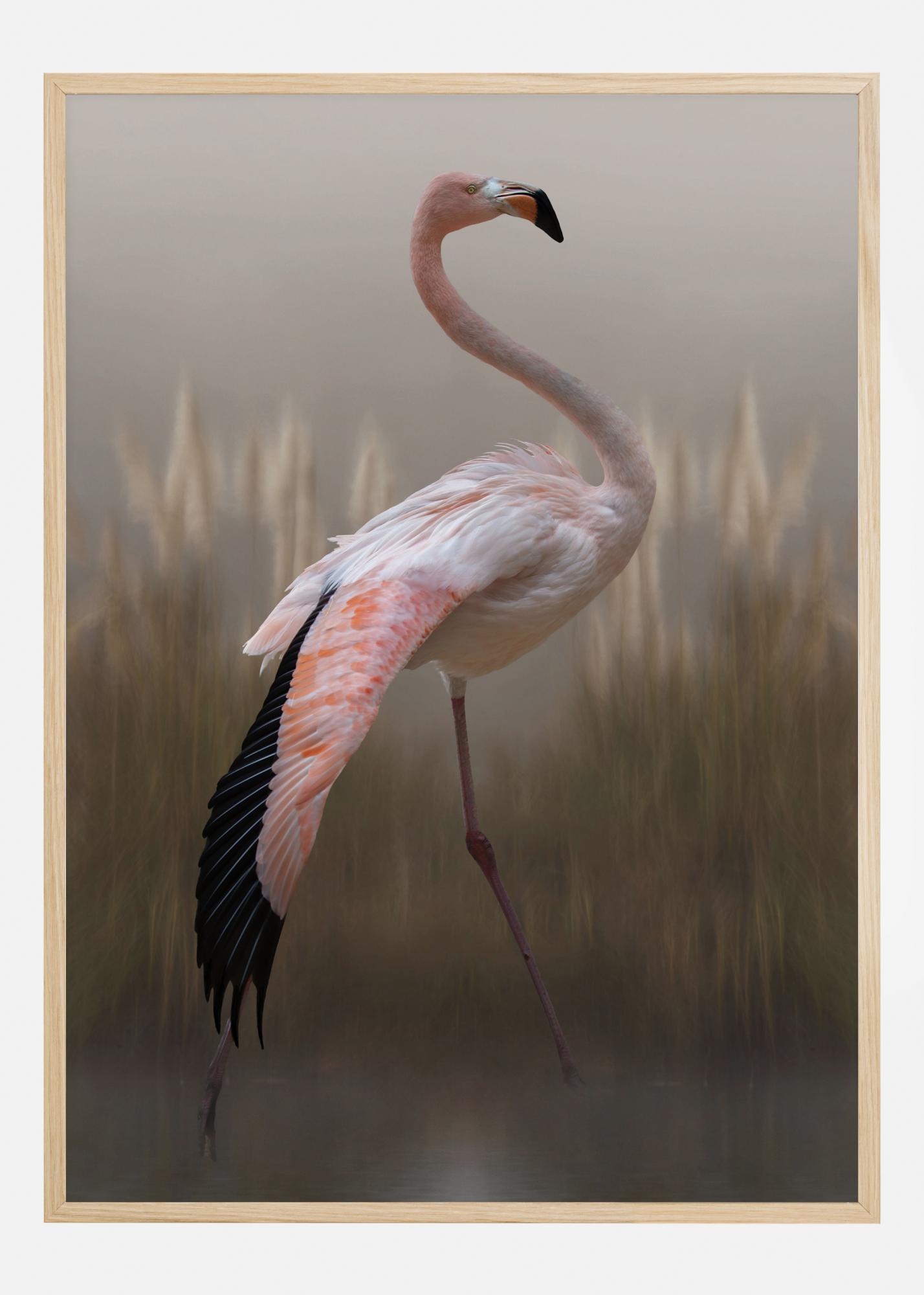 Un poster cu animale cu un flamingo roz mândru. Nuanțele de culoare și neclaritatea fotografiei dau aproape senzația de pictură. Poți să-ți imaginezi că te plimbi împreună cu pasărea atunci când combini acest poster cu un simplu perete albastru.