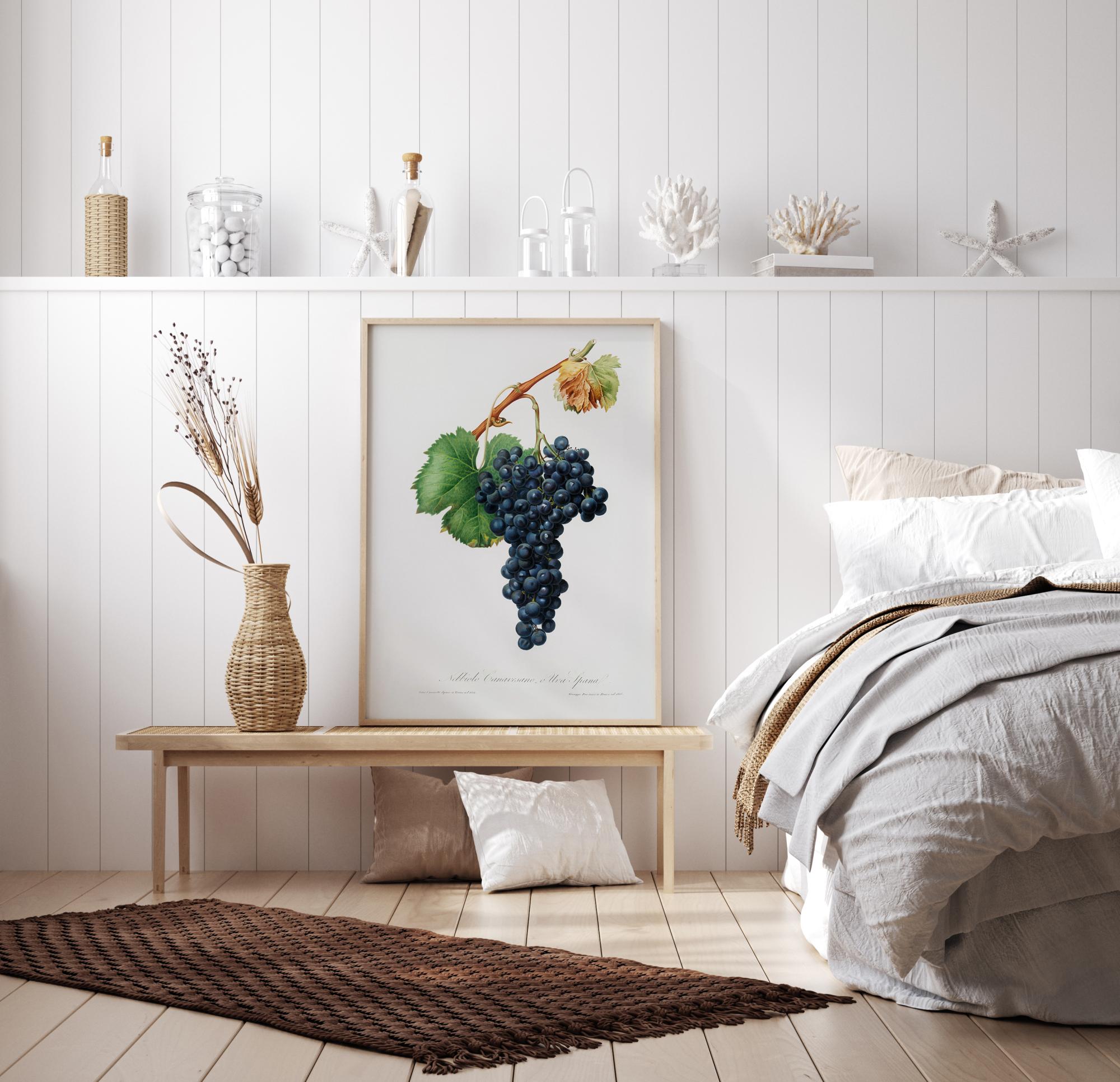 Un afiș botanic detaliat cu multe struguri de un albastru închis pe o viță de vie care atârnă în mijloc pe un fundal alb. Strugurii strălucitori negru-albăstrui arată suculenți și delicioși și atârnă atrăgător în mijlocul imaginii. Agață acest afiș în bucătăria ta pentru un pic de inspirație culinară.