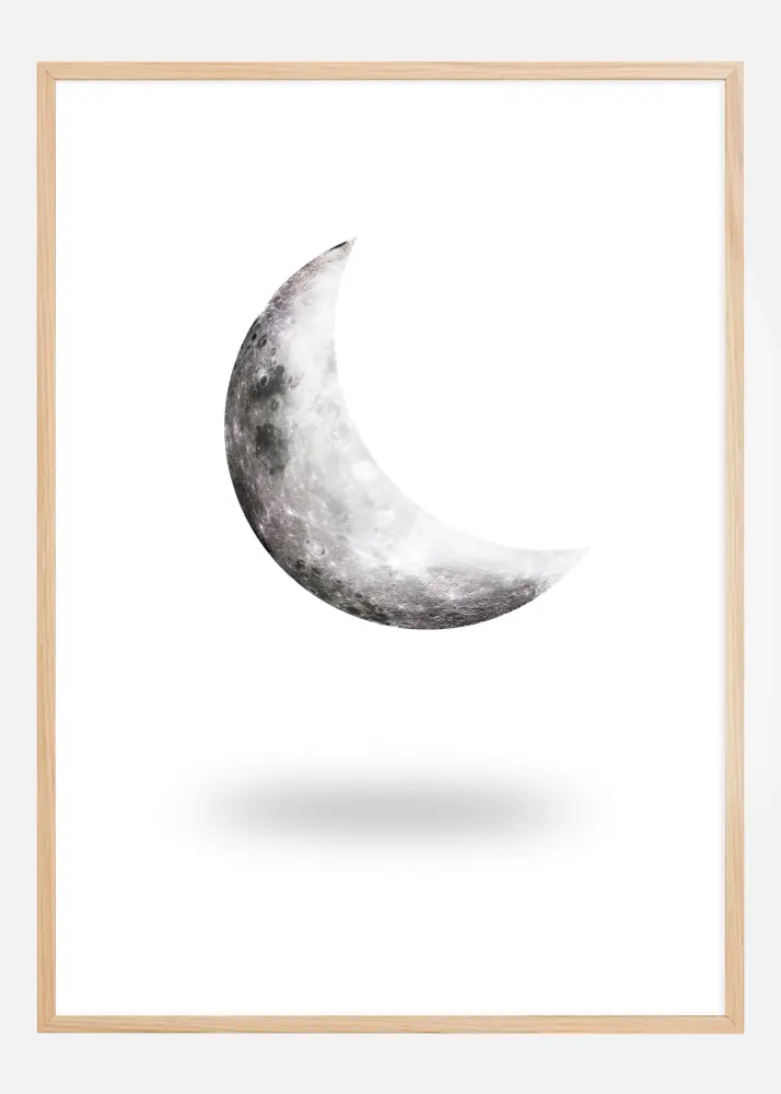 Această poster prezentază o ilustrație adorabilă a lunii în faza sa de creștere, unde craterele întunecate și înălțimile mai luminoase creează un model fascinant pe suprafața sa. Designul curat și minimalist al lunii, cu textura sa detaliată pe fundalul alb pur, face din aceasta o imagine atemporală care poate infuza o senzație de liniște și frumusețe universală în orice cameră.