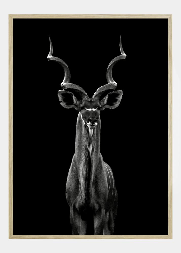 Un poster sălbatic cu un Kudu mai mare care stă impunător pe un fundal negru. Această antilopă majestică privește către cameră, coarnele spiralate tind să se ridice pentru a umple imaginea. Adaugă acest portret de animal uimitor alb-negru la casa ta pentru o notă de măreție.
