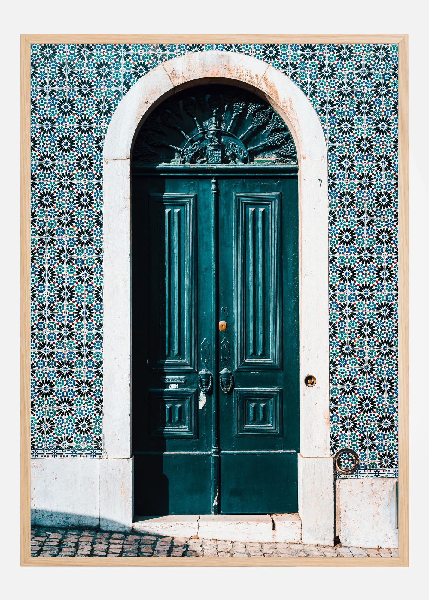 Această poster stilată prezintă o ușă verde impunătoare, frumos încadrată de plăci de faianță tradiționale, bogate în detalii, de culoare albastru și alb. Designul clasic și culoarea îndrăzneață a ușii contrastează cu modelele complicate, creând o senzație de bun venit și bogăție culturală. Imaginea transmite sentimentul unei intrări primitoare spre o casă plină de istorie și caracter.