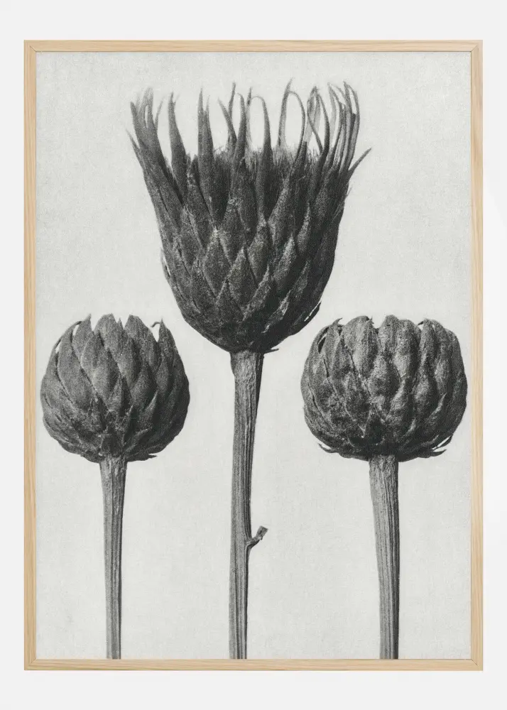 Un poster cu natură cu trei flori gri cu o singură tulpină. Cele trei flori gri se află înalțate pe un fundal alb și sunt aproape plasate una lângă alta. Floarea gri din prim-plan s-a deschis mai mult decât florile mai mici. Aceasta este imprimarea perfectă de agățat în grădina ta de iarnă.