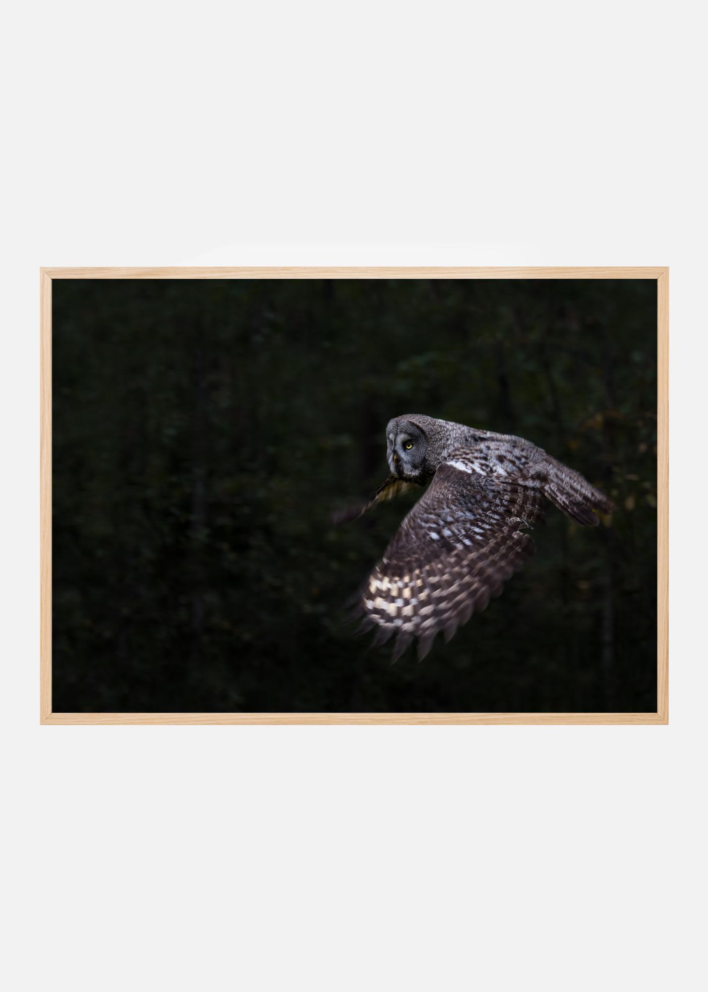 Un poster regal cu un bufniță maiestuoasă care zboară planând și fără efort prin pădure. Cu aripile întinse, poți aproape auzi liniștea. Ochii săi mari rotunzi și galbeni privesc în depărtare și observă atent prada de dedesubt. Simte puterea acestei imagini atunci când atârni această imprimare în casa ta.