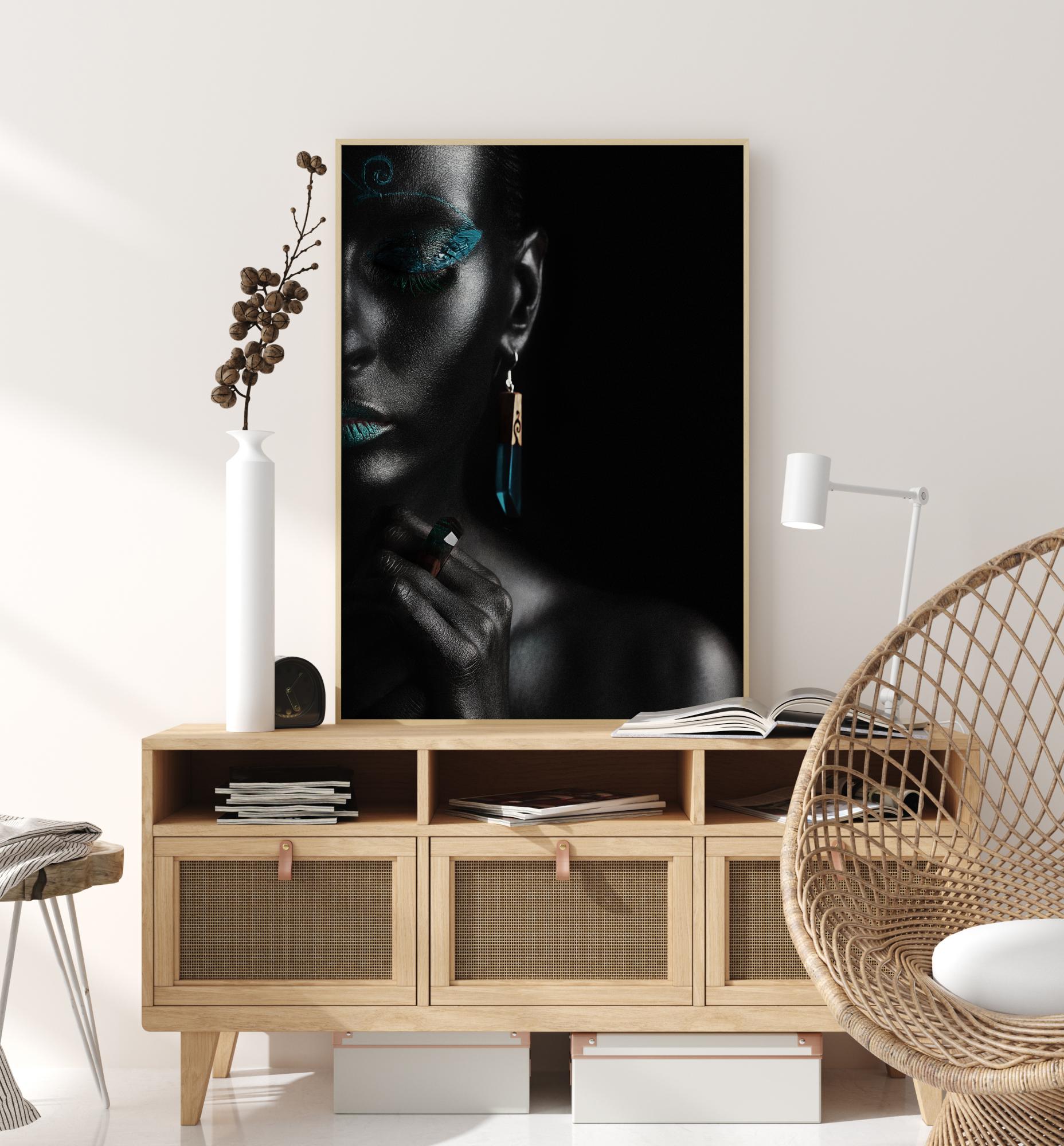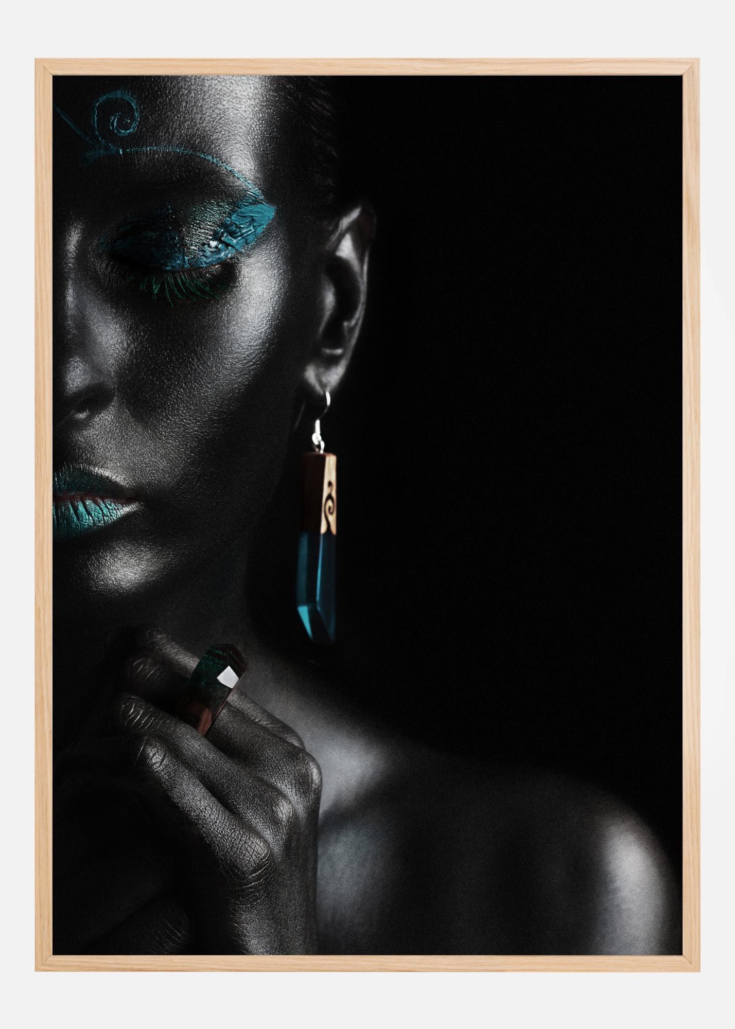 Un poster uluitor care înfățișează o femeie frumoasă adânc cufundată în gânduri. Pictată pe un fundal negru, ochii și gura femeii sunt evidențiate într-o culoare turcoaz profundă. Lumina de la fereastră luminează fața femeii. Lumina subliniază toate detaliile, făcând acest portret perfect pentru un perete alb gol.