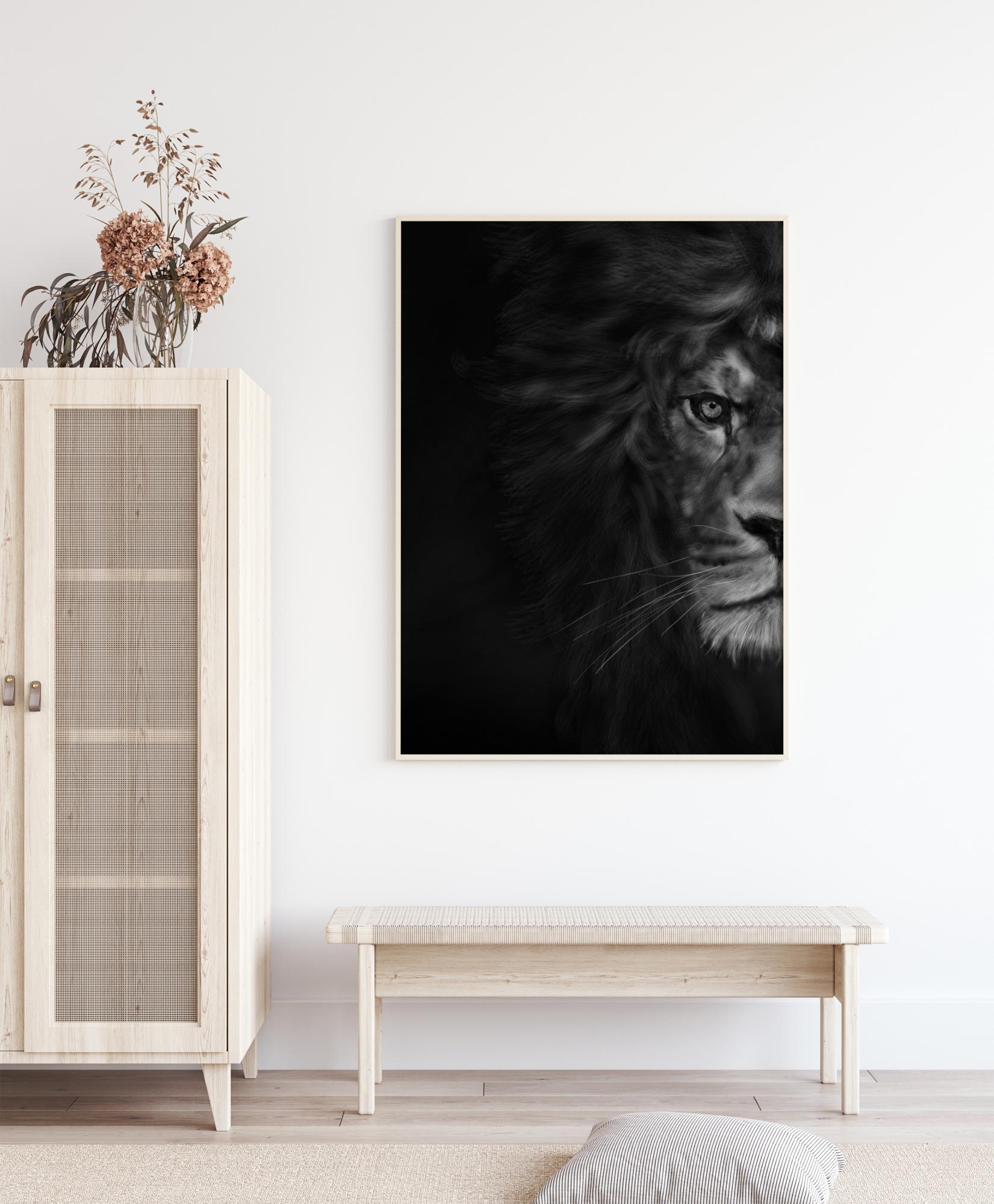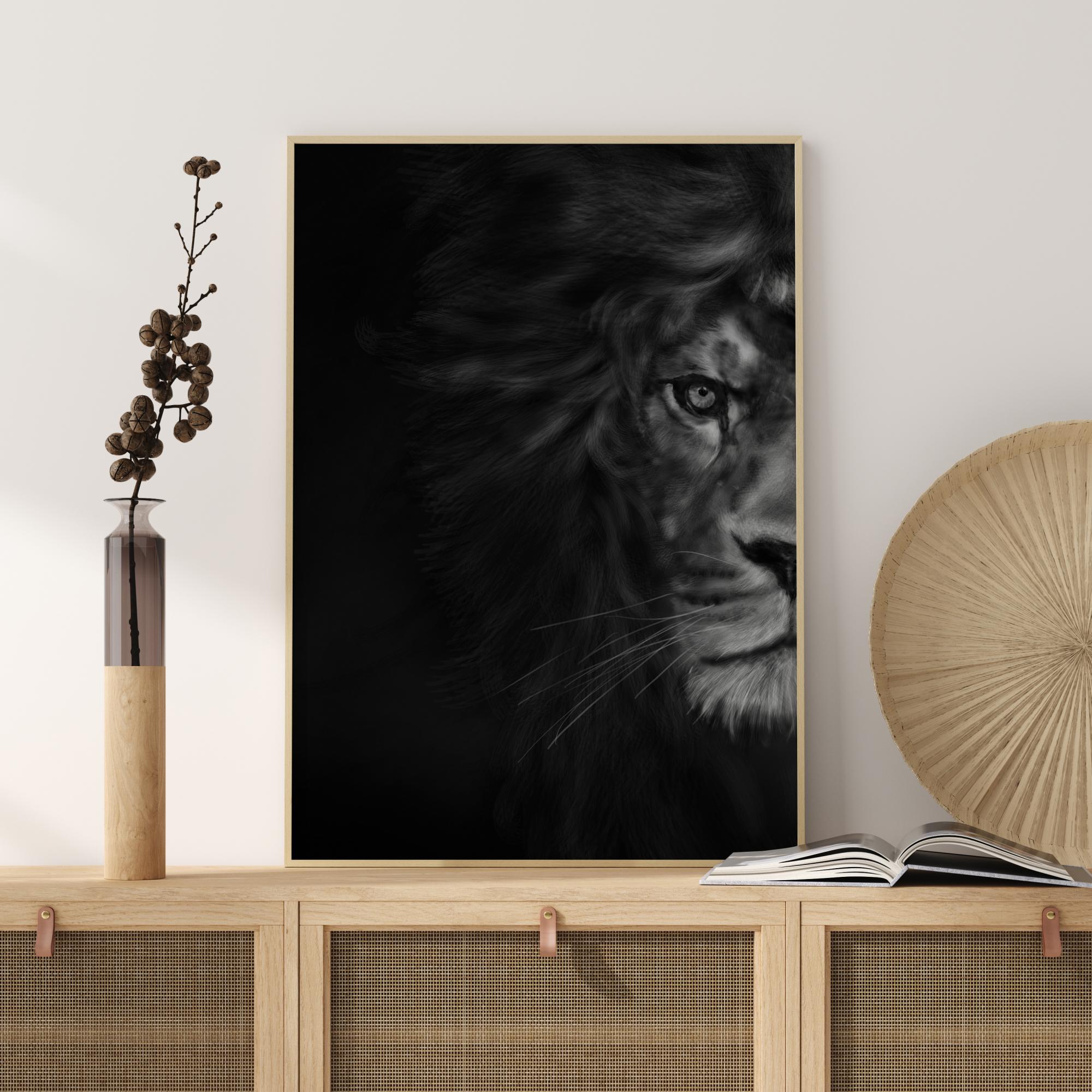 Un poster impresionant alb-negru de natură cu un leu sălbatic care privește direct în cameră. Plasat în partea dreaptă a imaginii se vede doar jumătate din fața leului. Cu mana sa frumoasă și ondulată și postura sa maiestuoasă, el poate fi cu siguranță definit ca regele junglei. Aduceți sentimentul de safari în casa voastră.
