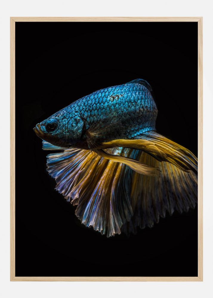 Un poster magnific cu peștii de luptă siamezi multicolori pe un fundal negru. Când se întoarce spre stânga, își arată înotătoarea de coadă multicoloră într-o varietate de culori. Atârnă acest tipar frumos pe un perete colorat pentru a crea un contrast de culori.