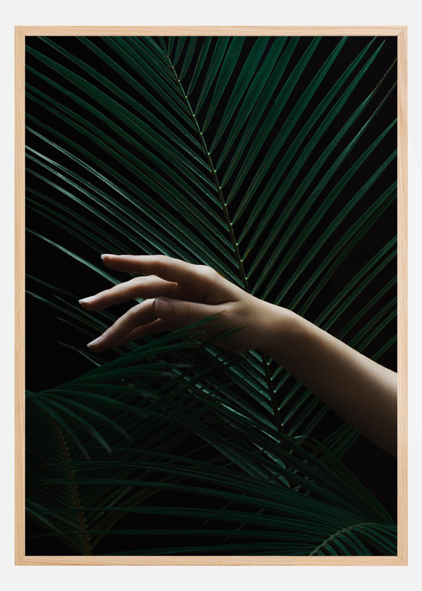 O fotografie botanică a unor ramuri verzi asemănătoare palmierilor pe un fundal negru. O mână întinsă contribuie cu un element viu și contrastant. Un poster întunecat care se potrivește perfect pe un perete mai mare de tablouri.