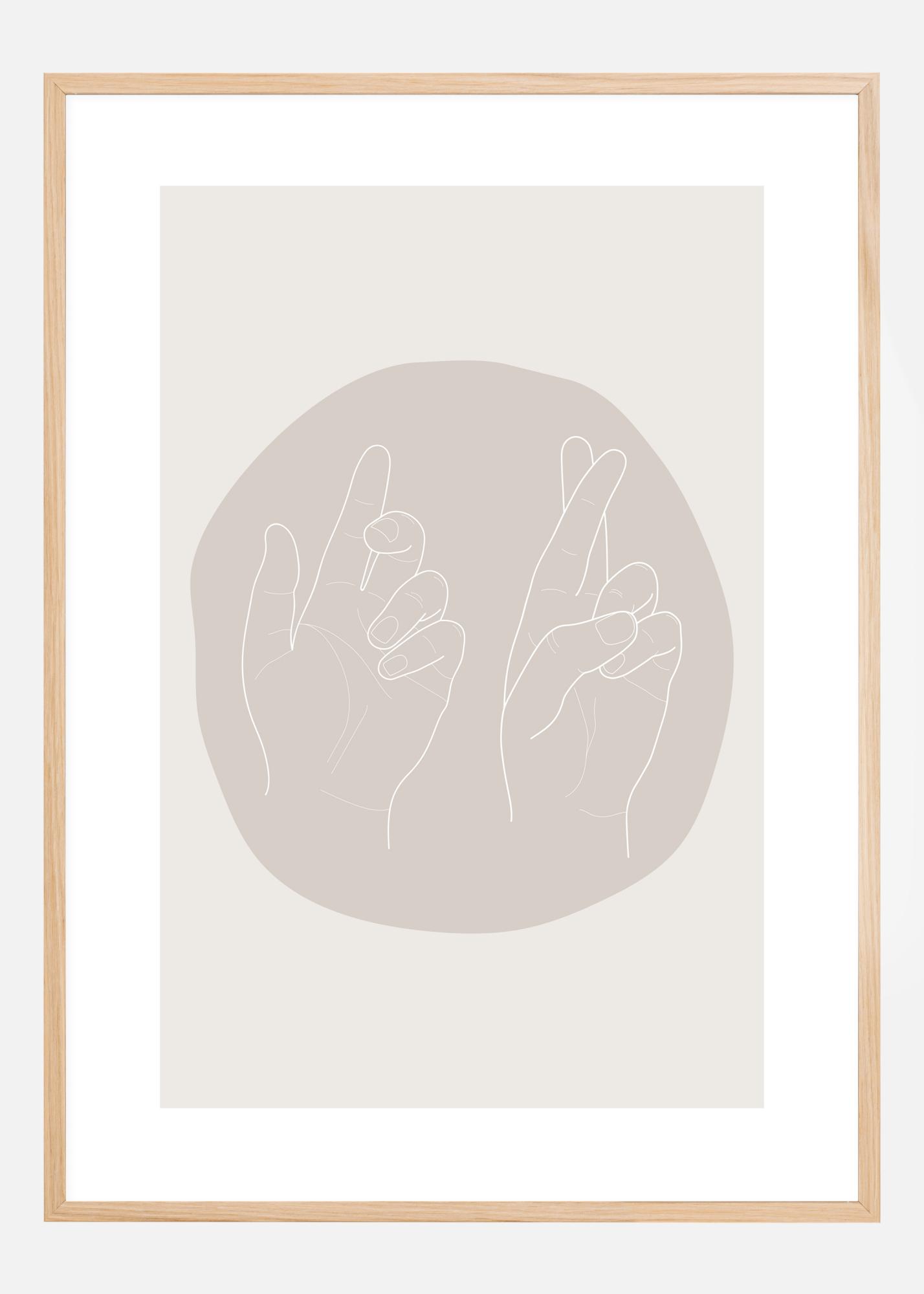 Un poster simplu cu două mâini stângi în fața unei forme rotunde bej. Cercul a fost plasat pe un fundal culoarea pielii, cu ambele mâini îndreptate către marginea superioară a posterului. Mâinile sunt relaxate și creează o atmosferă liniștită în casa ta. O imagine perfectă pentru biroul tău.