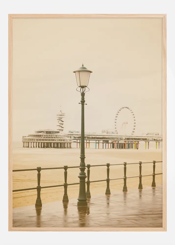 Această imagine nostalgică evocă sentimentul unei zile lente și visătoare la mare. Un felinar de modă veche stă în prim-plan, un paznic liniștit al promenadei goale cu balustrada sa clasică. În fundal, se vede un dig cu un turn de observație și un roată mare, adăugând o senzație de romantism atemporal al parcului de distracții. Tonurile blânde de sepia și bej întăresc senzația unei ere trecute și invită la reflecție.