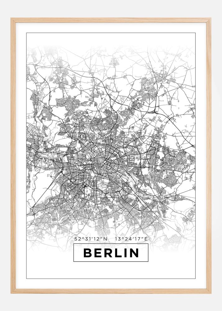 Aici vedem inima Germaniei desfășurându-se ca o floare în negru pe alb. Un poster cu hartă în format vertical care arată întreaga rețea rutieră a Berlinului încadrează toate străzile și piețele orașului. În partea de sus și de jos a imaginii, toate liniile negre ale hărții de oraș se estompează în alb și sunt înconjurate de un cadru negru subțire. În partea de jos a hărții, Berlin este tipărit cu litere mari, iar deasupra coordonatele orașului; Berlin încadrat ca și harta orașului în sine. Motivul este înconjurat de o margine albă puțin mai largă, care contribuie elegant la captarea atenției asupra conținutului său. Un poster cu hartă elegant și simplu care înfrumusețează ușor orice perete!