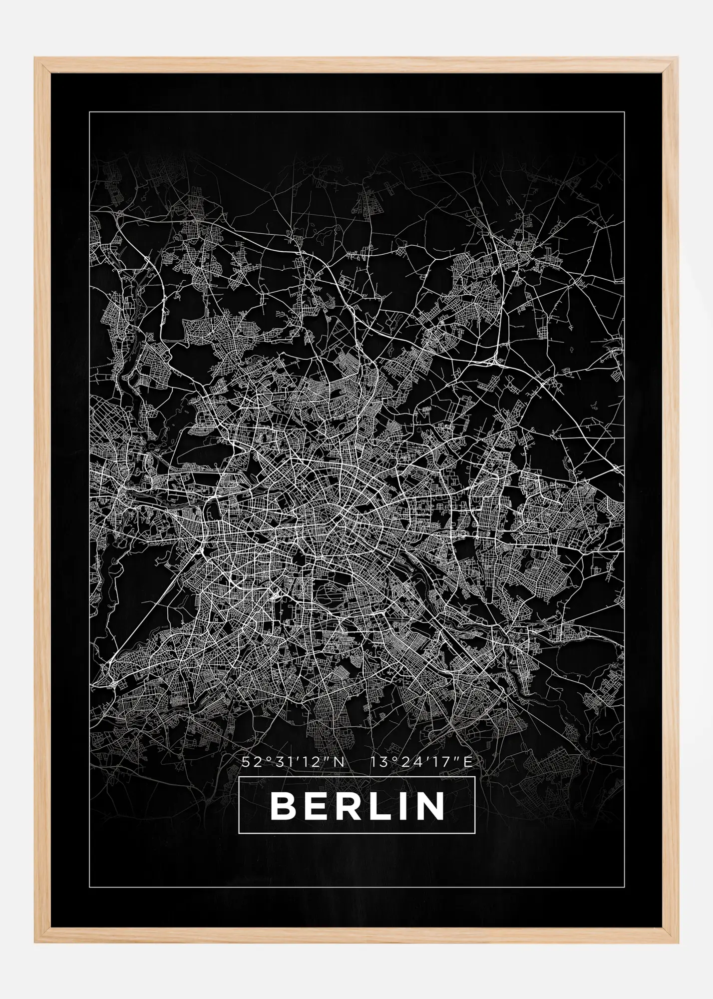 Dacă căutați un omagiu adus Berlinului, aceasta este o opțiune perfectă! Cu străzi și piețe în alb pe un fundal negru, harta orașului devine punctul perfect de atracție. În partea de jos a imaginii, se găsesc coordonatele orașului imprimate, chiar deasupra numelui orașului scris cu litere mari. Berlin, atât numele cât și harta, este elegant încadrat cu o linie subțire albă. Harta orașului este înconjurată apoi de o margine neagră lată care creează un spațiu aerisit atrăgător între ramă și conținutul posterului. Un poster cu hartă puternic și totodată elegant care funcționează ca un element decorativ perfect!