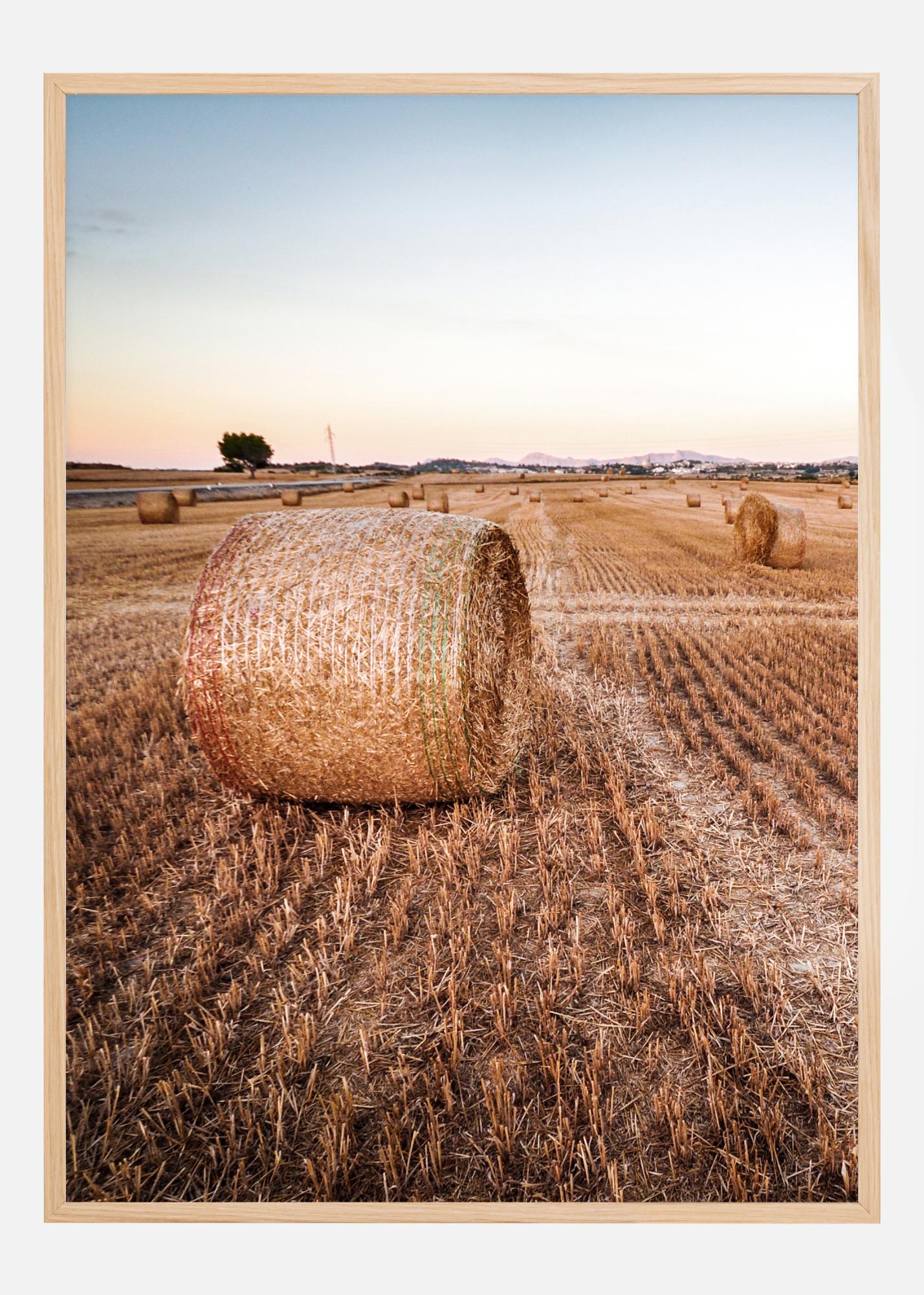 Un poster natural simplu, dar frumos. Stogul de fân din prim-plan este rulat elegant, în timp ce în depărtare există alte stoguri de fân rulate împrăștiate pe câmpuri. Un cer albastru deschis și culorile calde de maro creează o imagine caldă și relaxantă care poate fi agățată într-o bucătărie rustică.