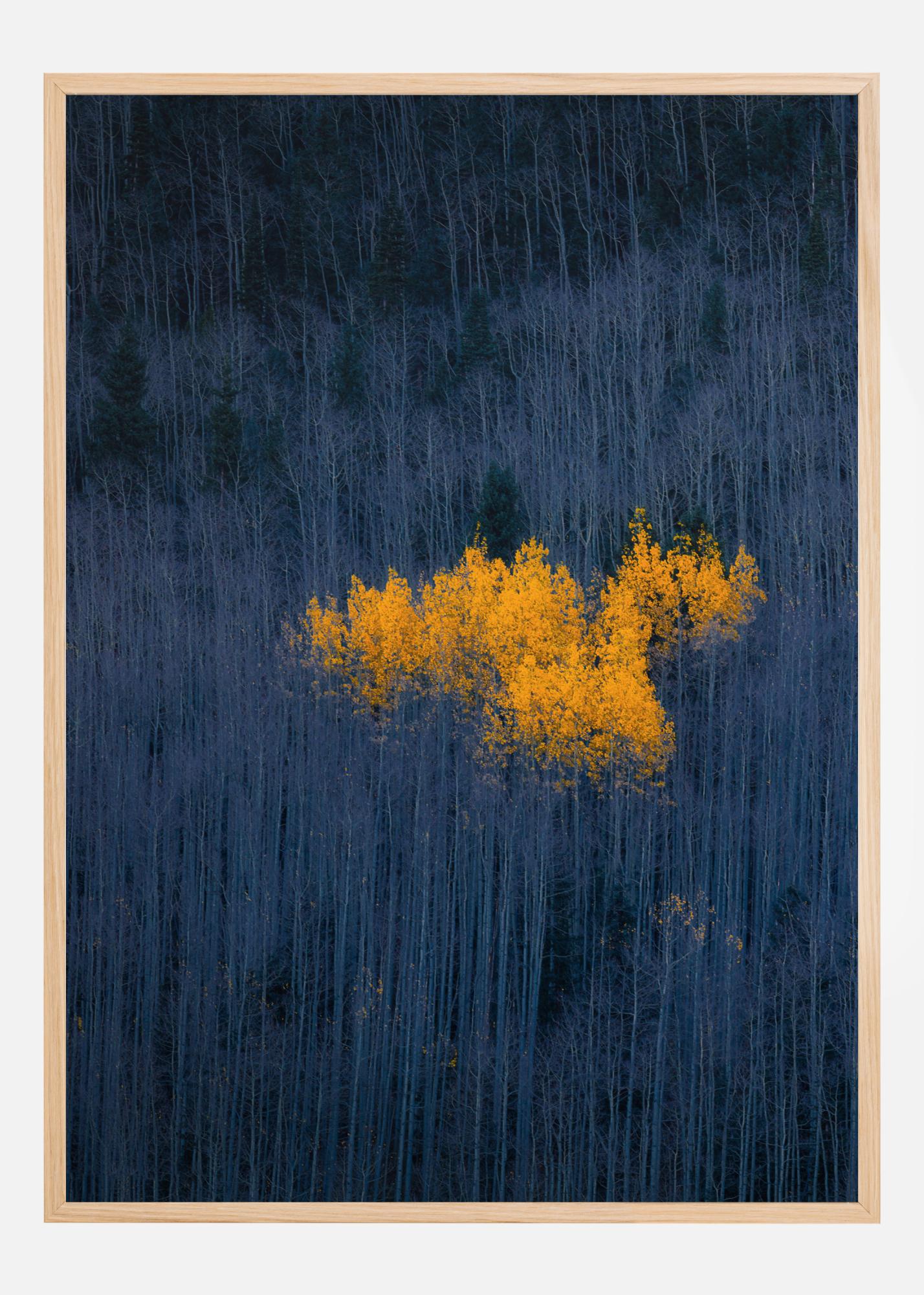 Un poster fantastic care înfățișează un copac verde închis și albastru de miezul nopții. În mijlocul printului, vârfurile copacilor sunt evidențiate în galben, oferind printului puțină culoare. Un print frumos de agățat într-o cameră de zi pentru a crea o atmosferă relaxantă.