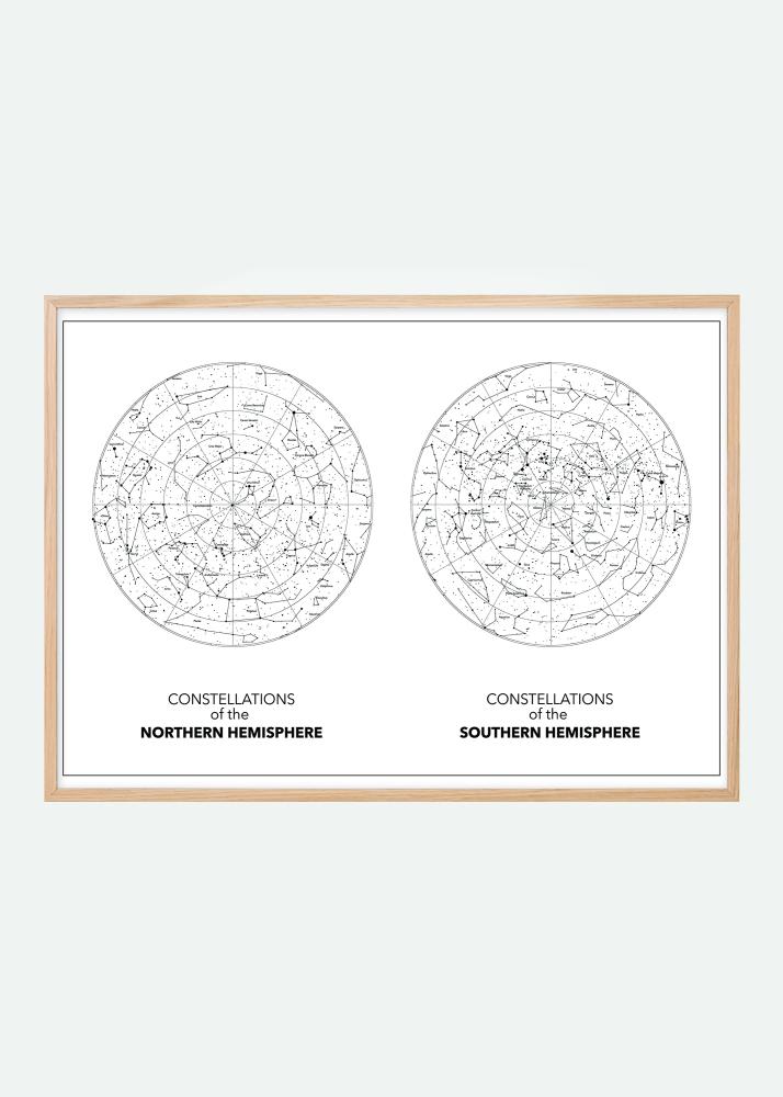 Un poster alb-negru cu cerul înstelat nordic și sudic. Pe fundalul alb, constelațiile sunt slab conturate în negru. Așezate una lângă alta, poți admira misterul stelelor. Agățați această imagine în biroul dvs. și creați o senzație de infinitate.