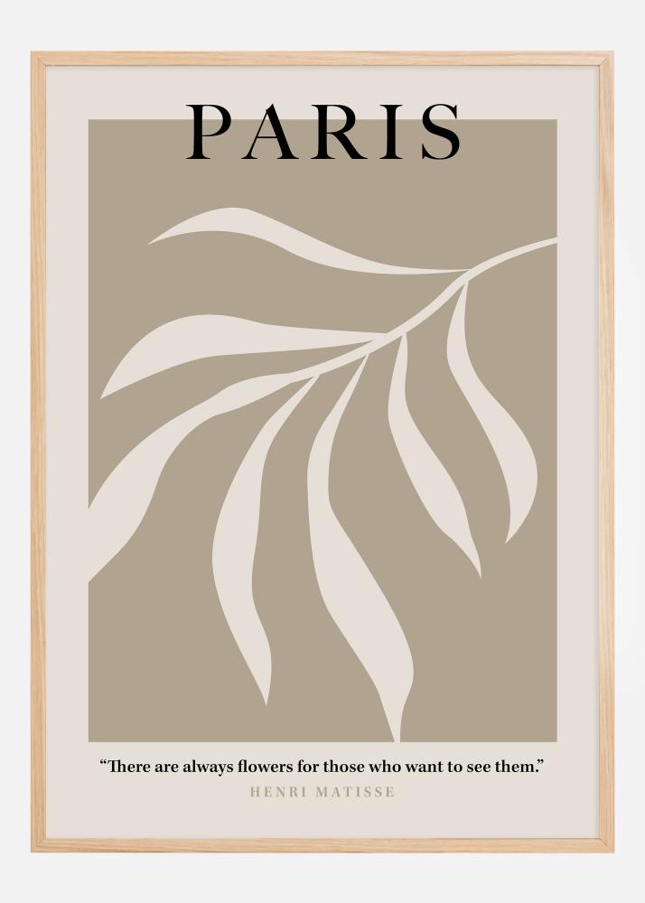 Această poster elegant și stilat celebrează Parisul, orașul care a inspirat atât de mulți artiști și poeți. Designul său simplu dar puternic constă din linii albe care formează o floră abstractă, pe un fundal bej uniform. Textul "PARIS" este plasat cu grijă în partea de sus, oferind o asociere directă cu clasa și atemporalitatea orașului. În partea de jos se află un citat de Henri Matisse, "There are always flowers for those who want to see them.", care adaugă un strat de profunzime și reflecție la acest poster deja semnificativ.