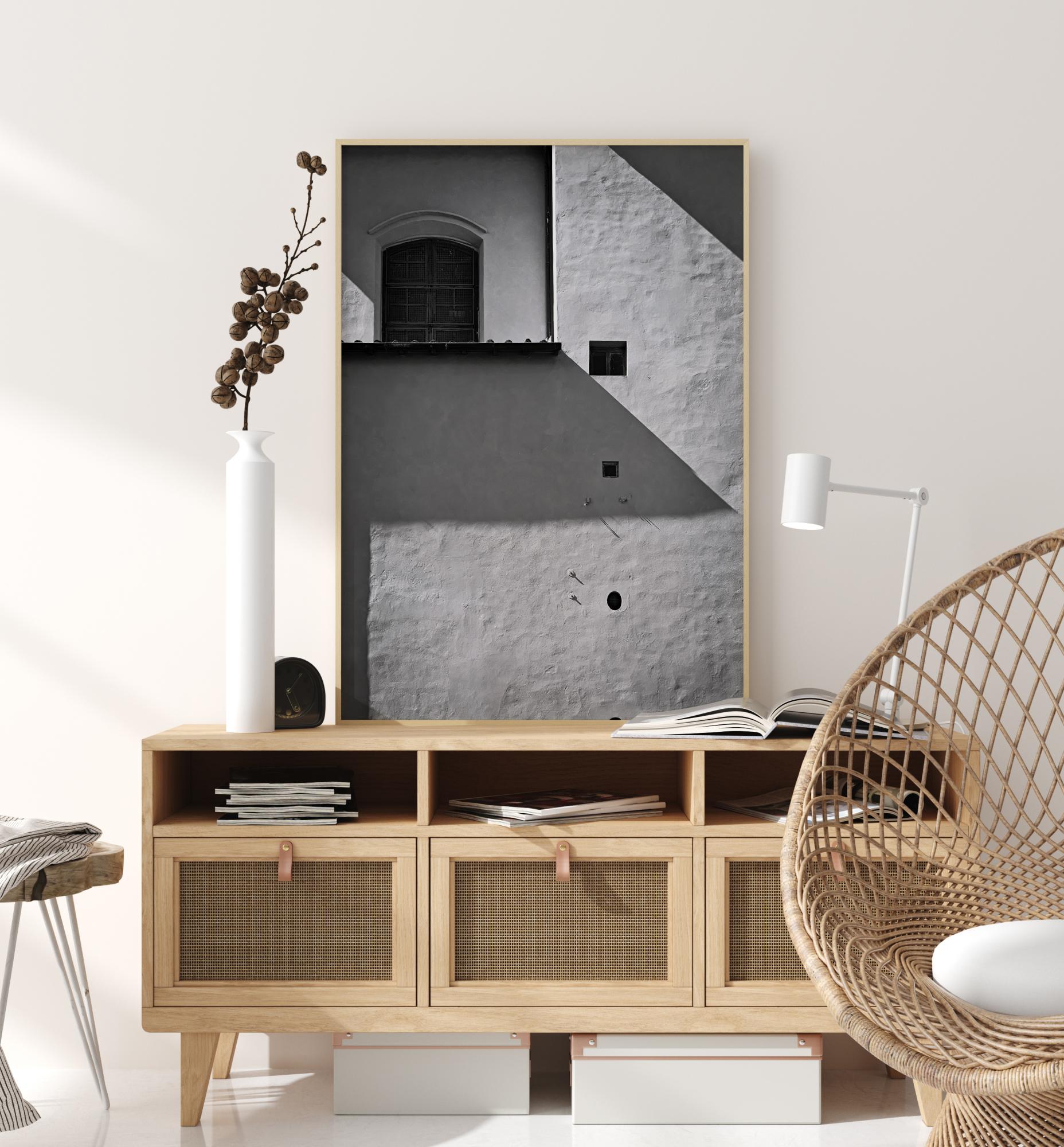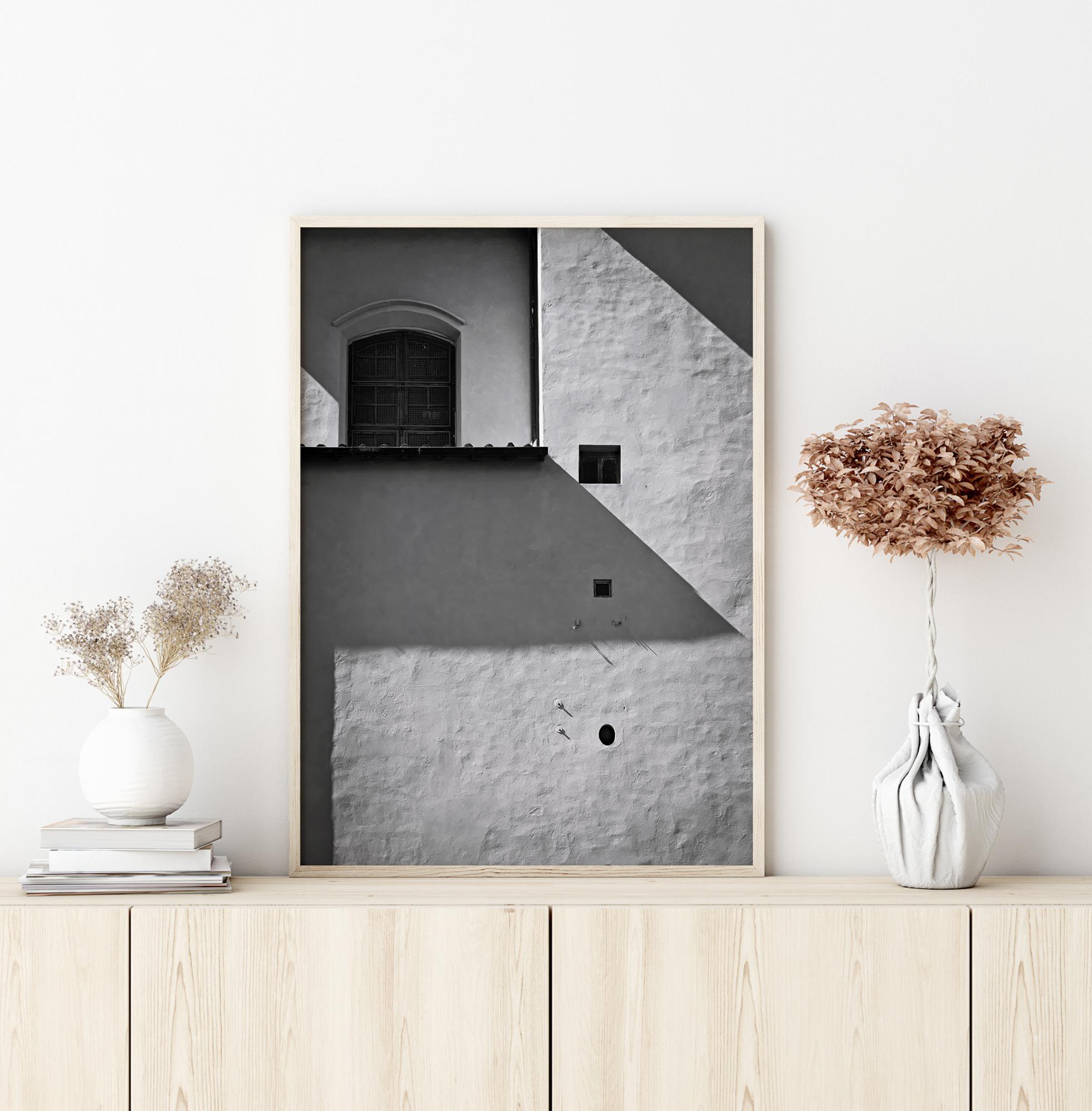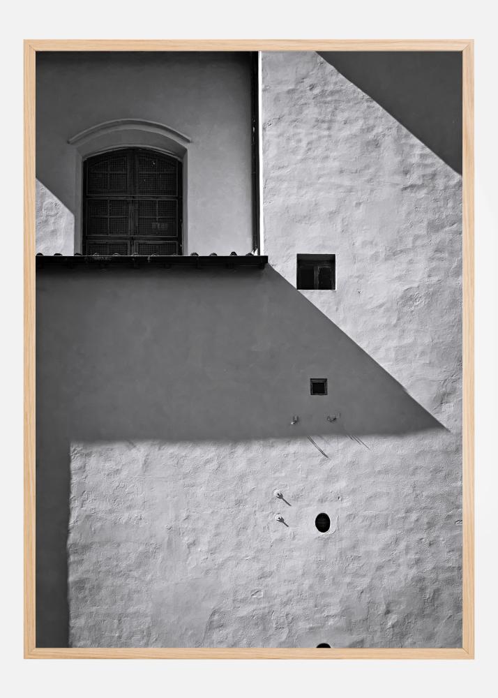 Un poster simplu, dar frumos, alb-negru cu o ușă de lemn în mijlocul imaginii. Lumina naturală a soarelui aruncă o umbră pe perete. Patru mici găuri sunt plasate una sub cealaltă în dreapta imaginii. Folosește-ți imaginația pentru a descoperi ce se află în spatele marii uși de lemn.