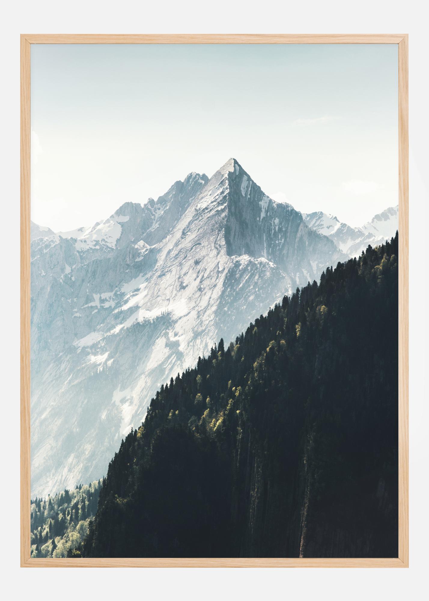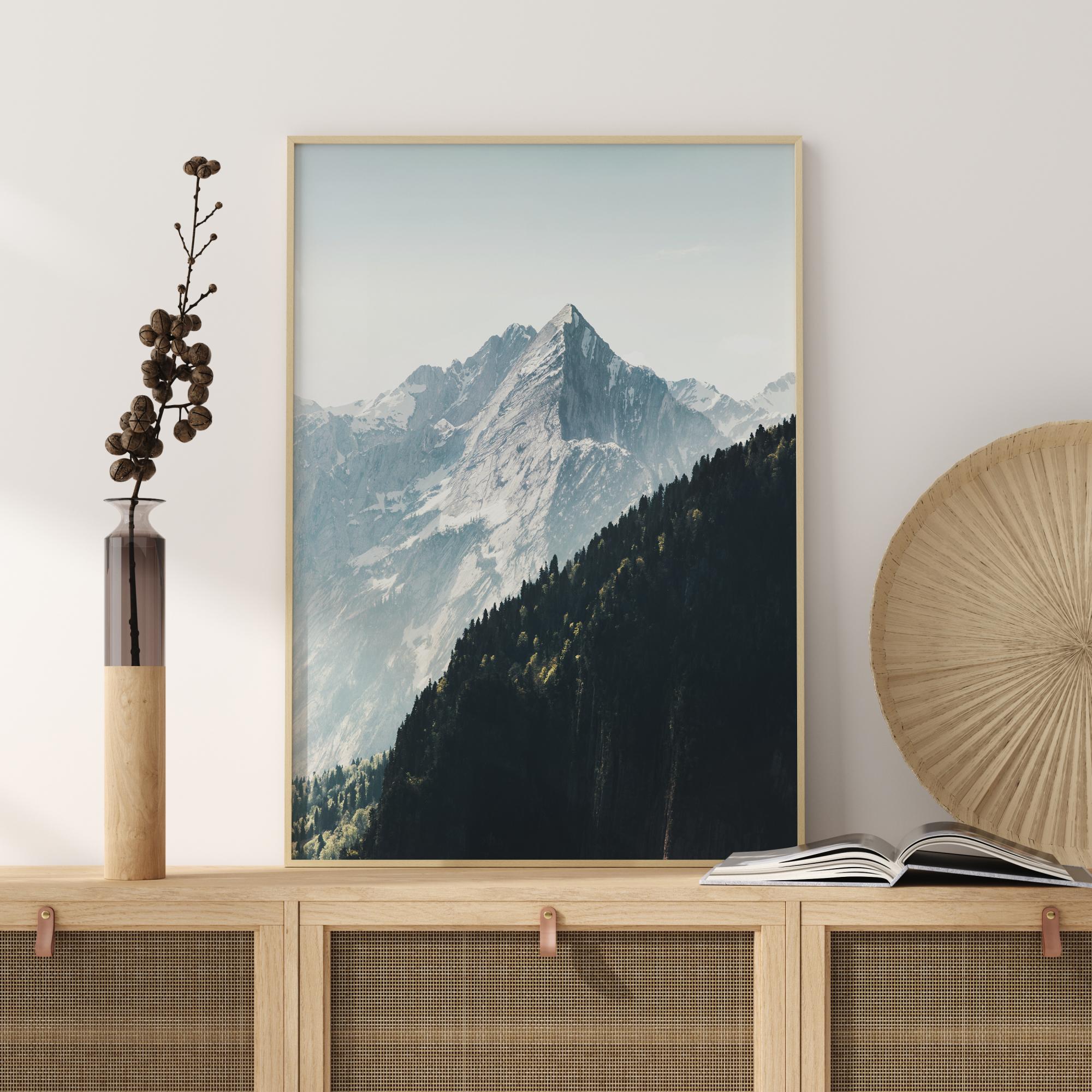 Un peisaj pitoresc cu munți acoperiți de zăpadă sub un cer albastru deschis. În prim-plan, o pădure verde închis acoperă parțial priveliștea asupra munților și creează o atmosferă frumoasă de iarnă. Un poster perfect pentru a fi agățat deasupra unui șemineu.