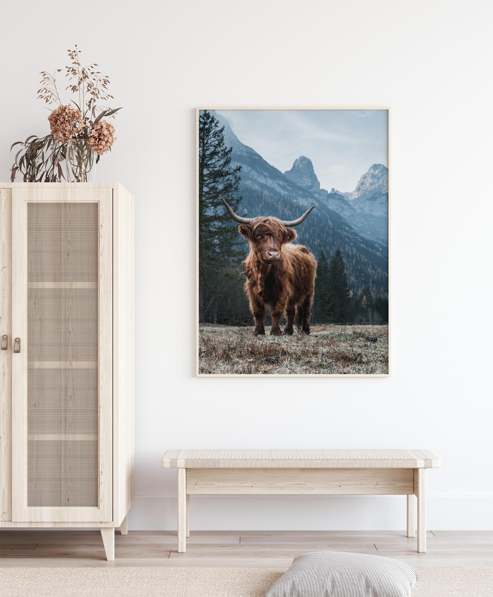 Un poster sălbatic cu o vacă de înaltă țară roșcată care stă singură pe un câmp. Munții abrupți, acoperiți cu zăpadă, încadrează acest frumos animal. Cu blana sa scurtă și zbârlită, care suportă condiții aspre, animalul nu pare deranjat de nimic. Folosește-ți imaginația și imaginează-ți că te afli pe câmpiile scoțiene.
