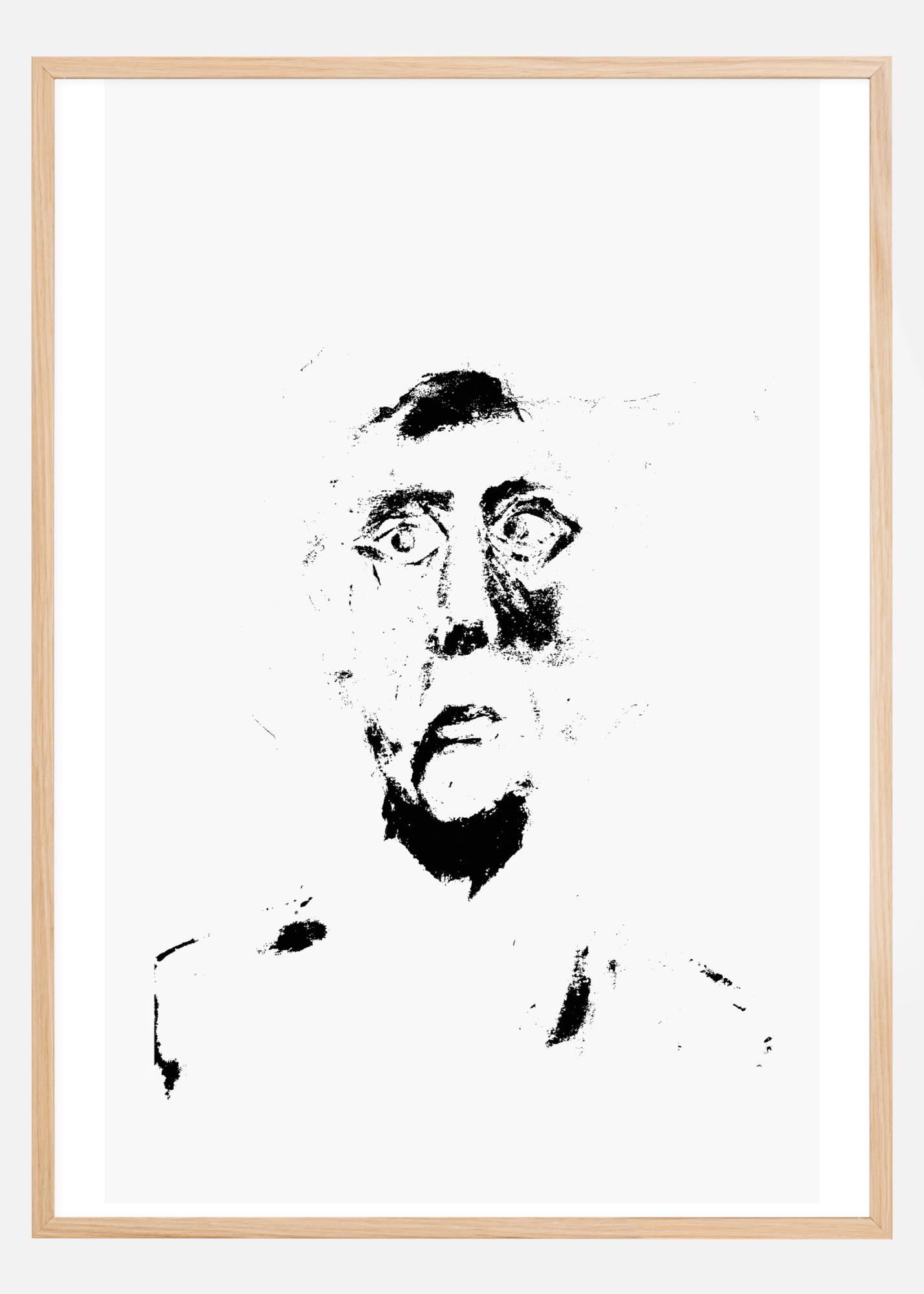 Un portret înspăimântător alb-negru cu capul și umerii. Pe un fundal alb, nuanțele întunecate evidențiază părul, obrazul și gâtul persoanei. Ochii mari ai persoanei exprimă frică și misticism. O imagine tristă și înspăimântătoare care transmite o senzație de groază.