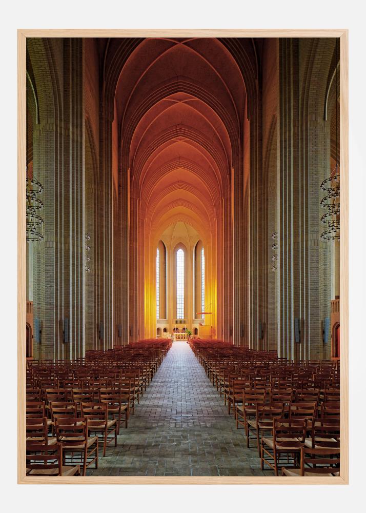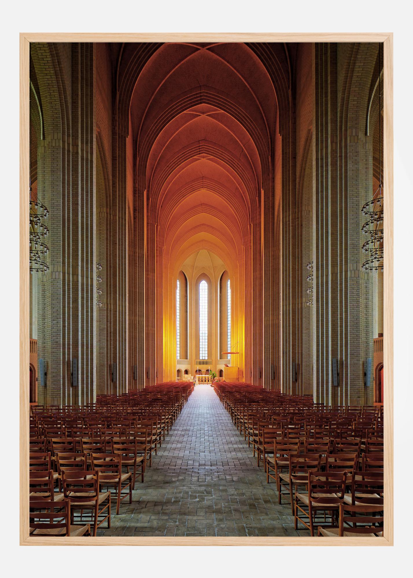Un poster arhitectural uimitor în interiorul unei biserici. Naosul lung al bisericii duce la altar și tavanul înalt împreună cu coloanele din piatră oferă o senzație foarte liniștitoare. Lumina portocalie se reflectă prin ferestre și creează o senzație de căldură și armonie. Experimentează liniștea în această imagine.