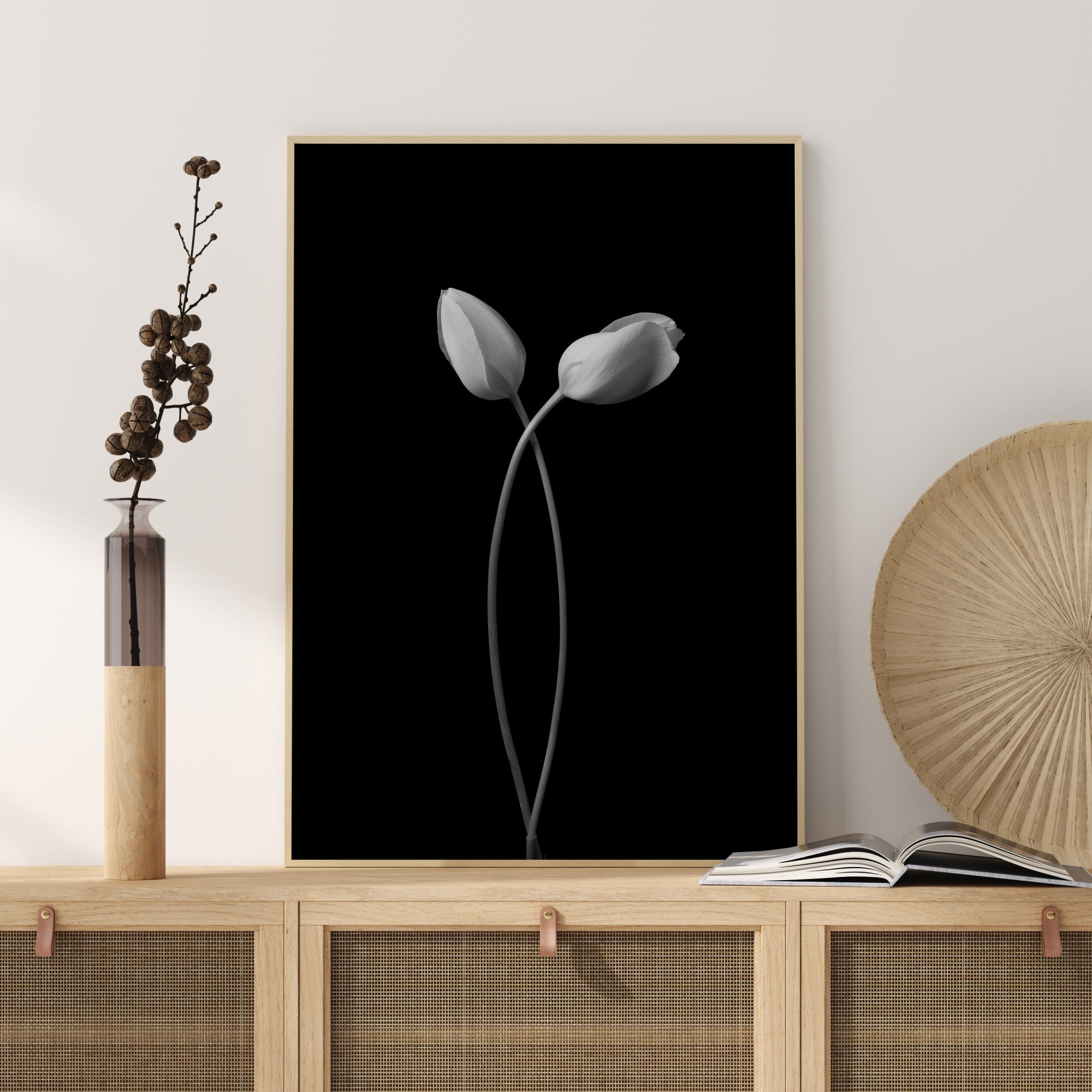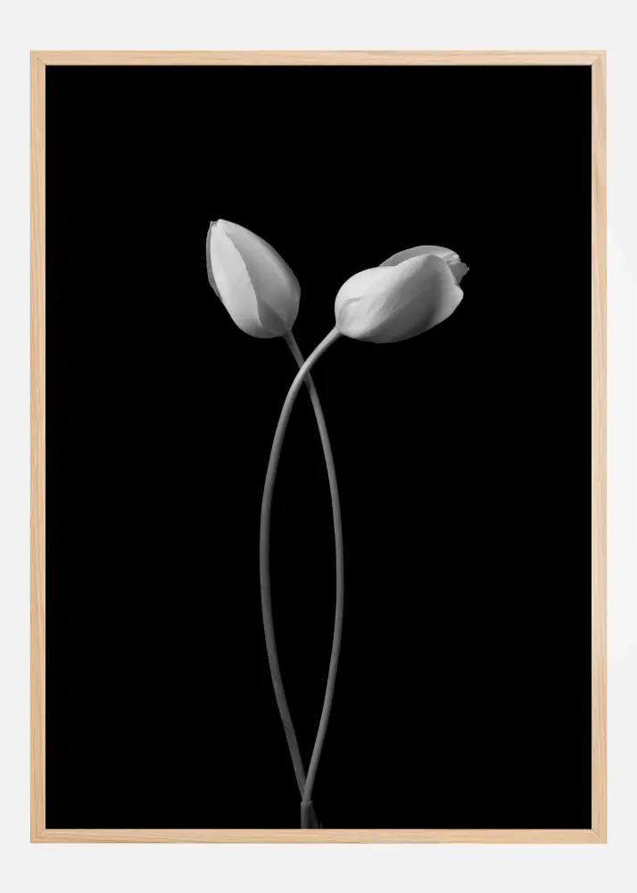Un poster elegant cu două lalele care se îmbrățișează pe un fundal negru simplu. Plasează-l pe un perete galben pentru a adăuga culoare acestei scene dramatice. Simte conexiunea naturii cu acest poster.