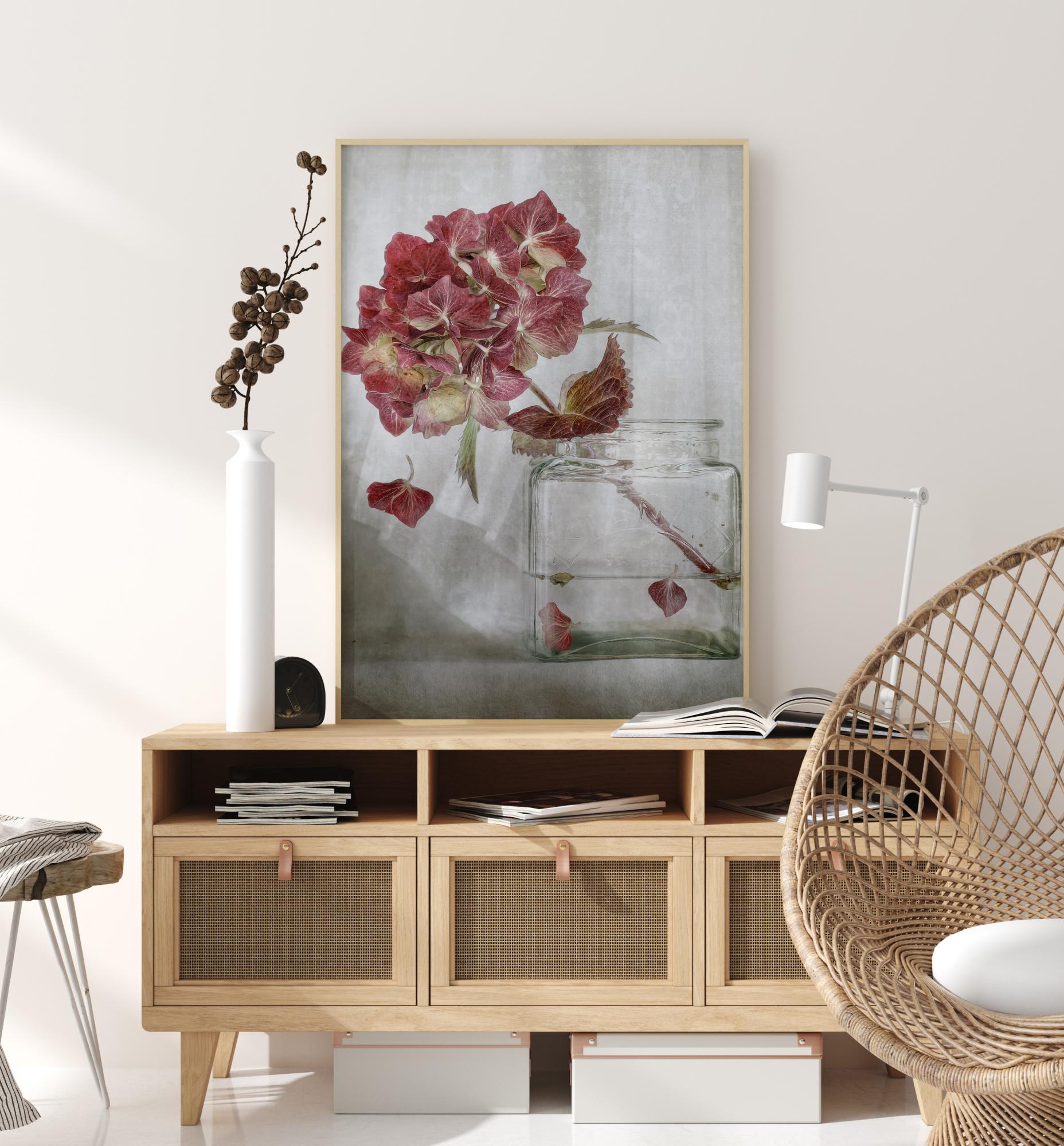 Un poster frumos cu natură, cu o tulpină de hortensie într-o vază transparentă. În fața unei perdele albe cu flori cade un petală roz delicat. Perdeaua fâlfâie într-o adiere ușoară. Această imagine te face aproape să simți briza.
