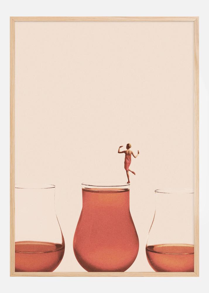 Această poster estetic, cultivat și atrăgător, înfățișează o figură feminină care efectuează un act delicat de echilibru deasupra marginii unui pahar de vin plin până la refuz. Femeia, îmbrăcată într-o rochie, pare să danseze sau să se miște cu o grație nobilă, o imagine de control și precizie într-o acțiune care poate părea riscantă. Silueta ei apare aproape ca o metaforă pentru abordarea fină necesară pentru a savura lucrurile mai rafinate din viață, cu o apreciere echilibrată pentru plin și gol.