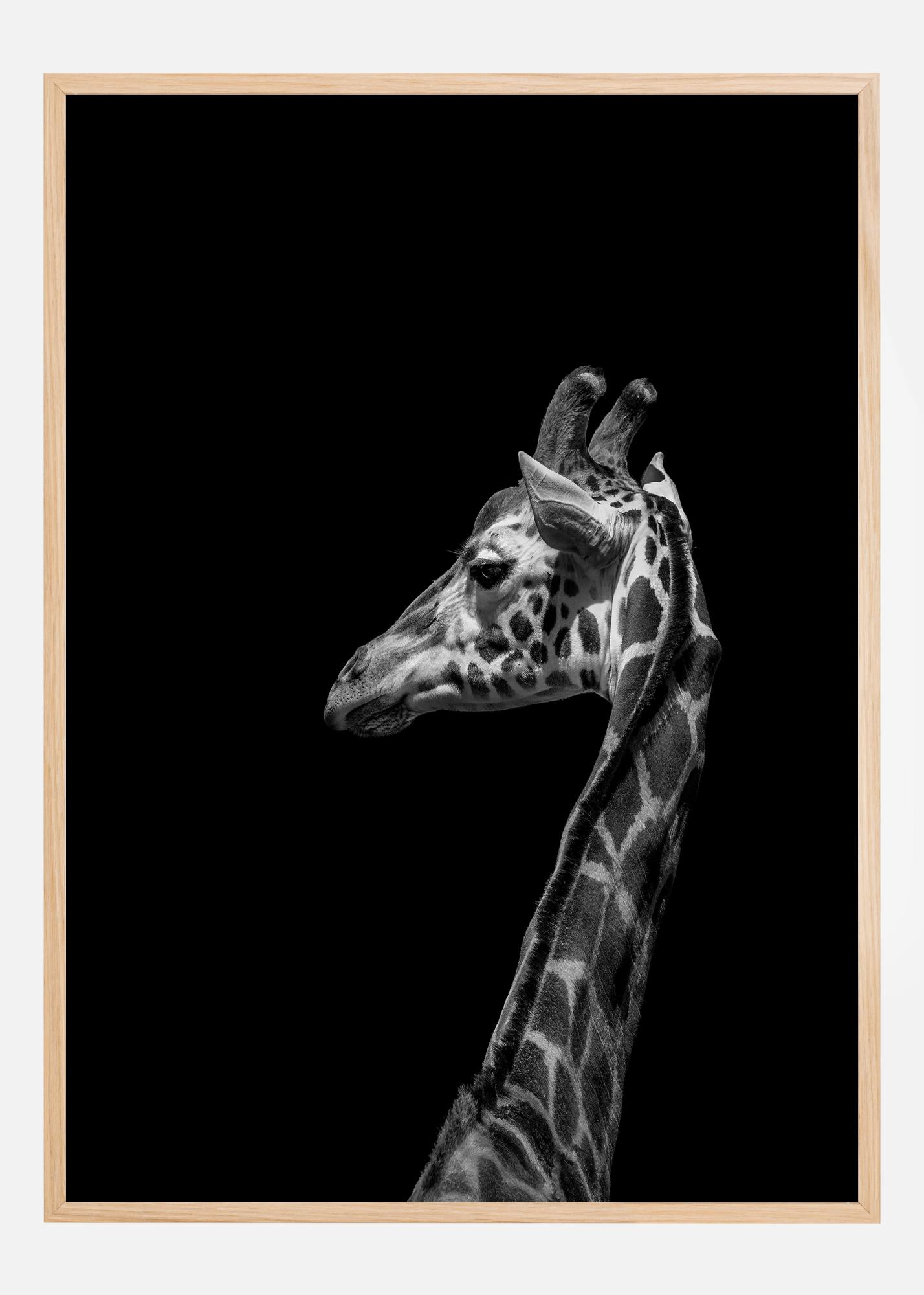 Aceast poster îndrăzneț și expresiv prezintă o girafă impunătoare pe un fundal negru ca tăciunele, creând un contrast dramatic care captează privirea spectatorului. Modelul unic al girafei în tonuri de gri este surprins abil, fiecare pată și linie fiind evidențiată în detaliu. Bogăția detaliilor texturii pielii girafei și nuanțele delicate de gri pe fundalul negru oferă un efect aproape tridimensional.