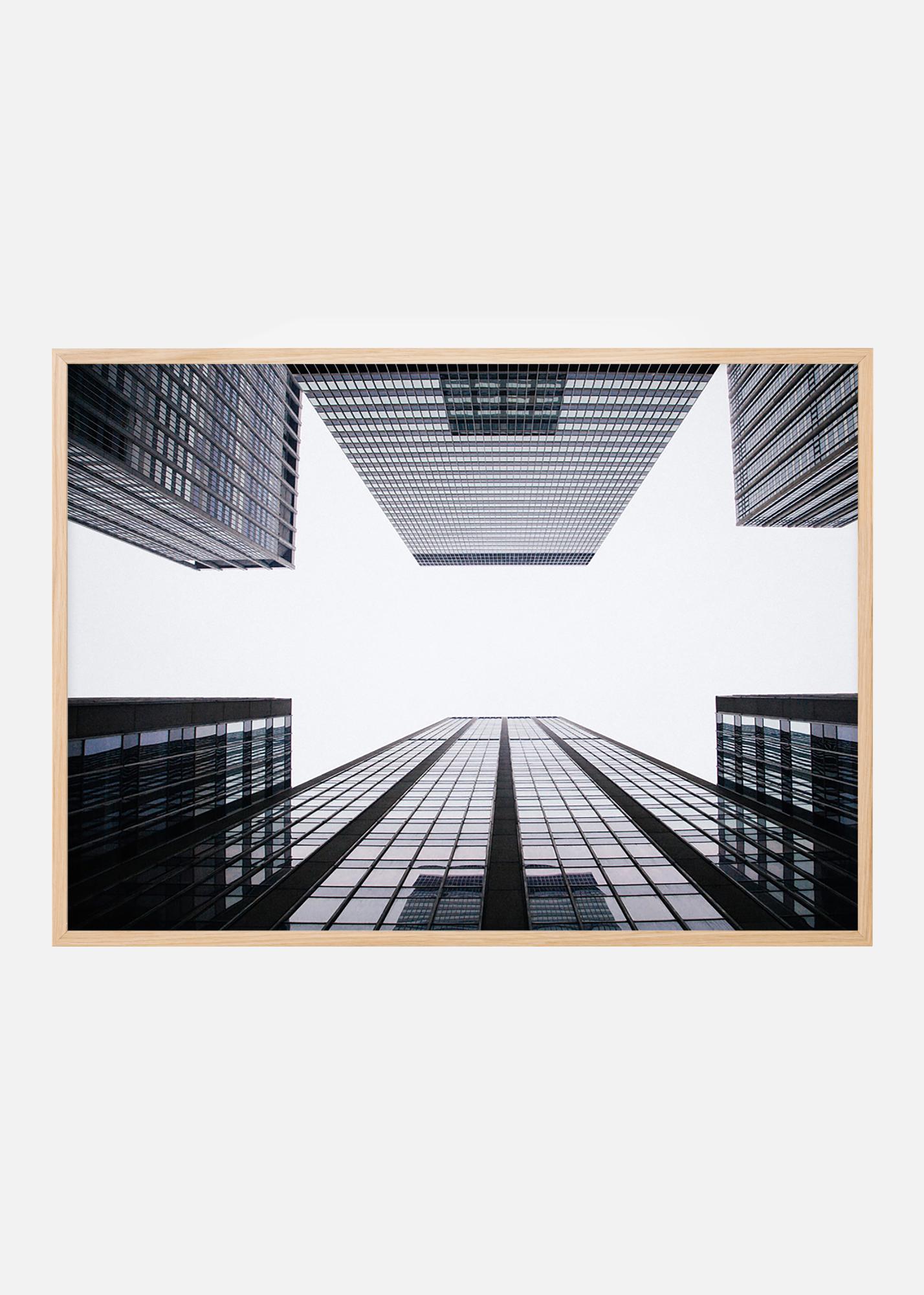 Poster de arhitectură cu zgârie-nori în creștere pe un cer alb ca norii. Imagine elegantă cu clădiri întunecate pe un fundal alb, cu reflecțiile cerului în geamuri. Cadoul perfect pentru cei care iubesc portretele grafice de clădiri. Printul arată bine într-o ramă neagră care întărește întunericul din imagine și se combină frumos cu alte fotografii de arhitectură.