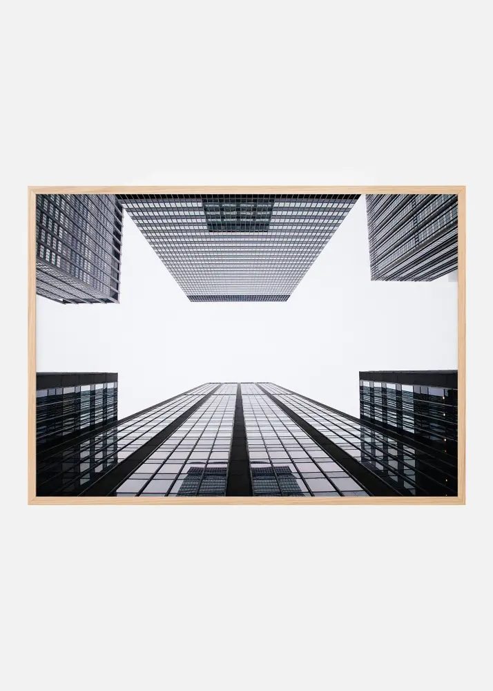 Poster de arhitectură cu zgârie-nori în creștere pe un cer alb noros. Imagine elegantă cu clădiri întunecate pe un fundal alb, cu reflecțiile cerului în ferestrele de sticlă. Un cadou perfect pentru cei care iubesc portretele grafice ale clădirilor. Printul arată excelent într-o ramă neagră care accentuează întunericul din imagine și arată bine în combinație cu alte fotografii de arhitectură.