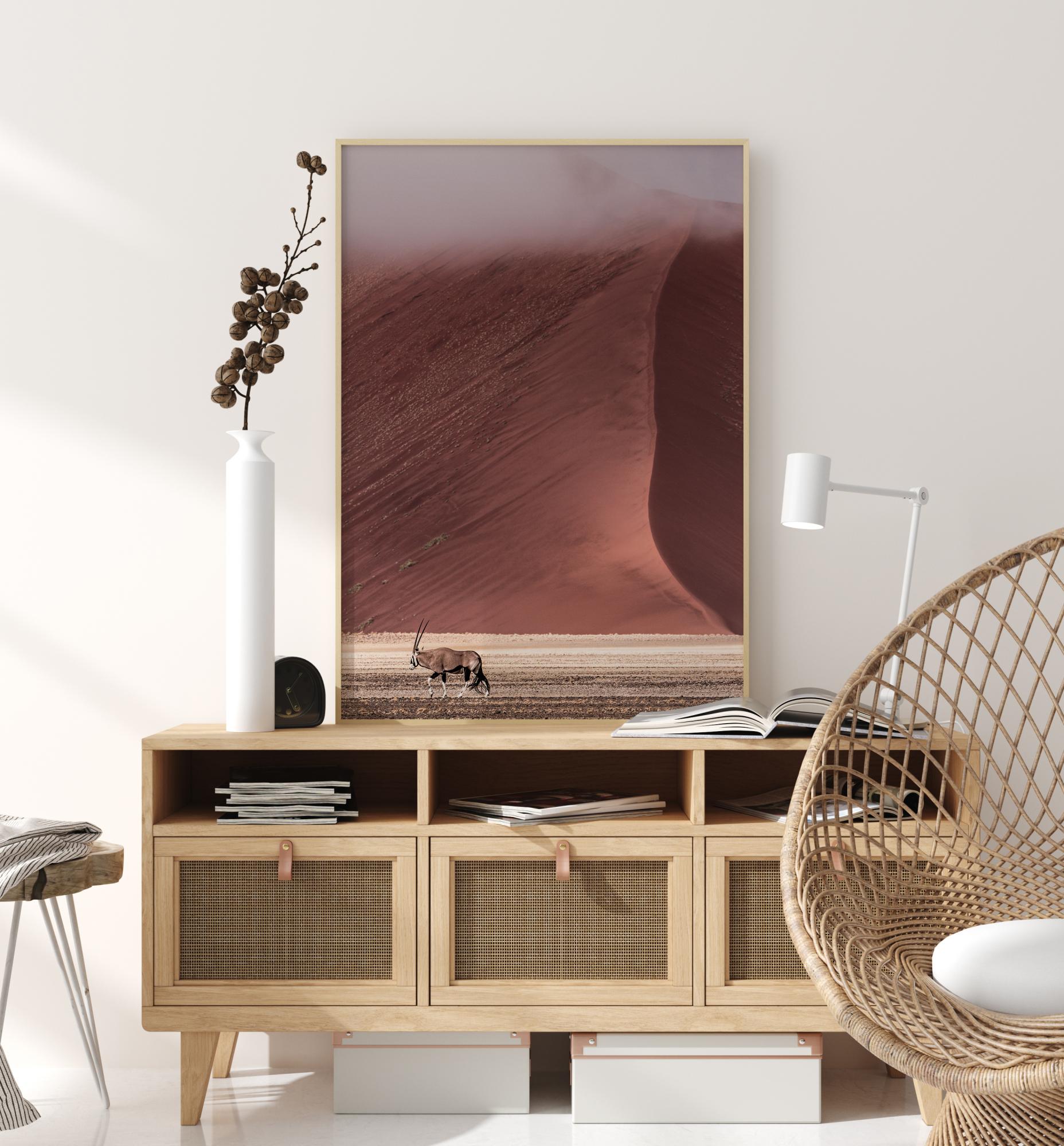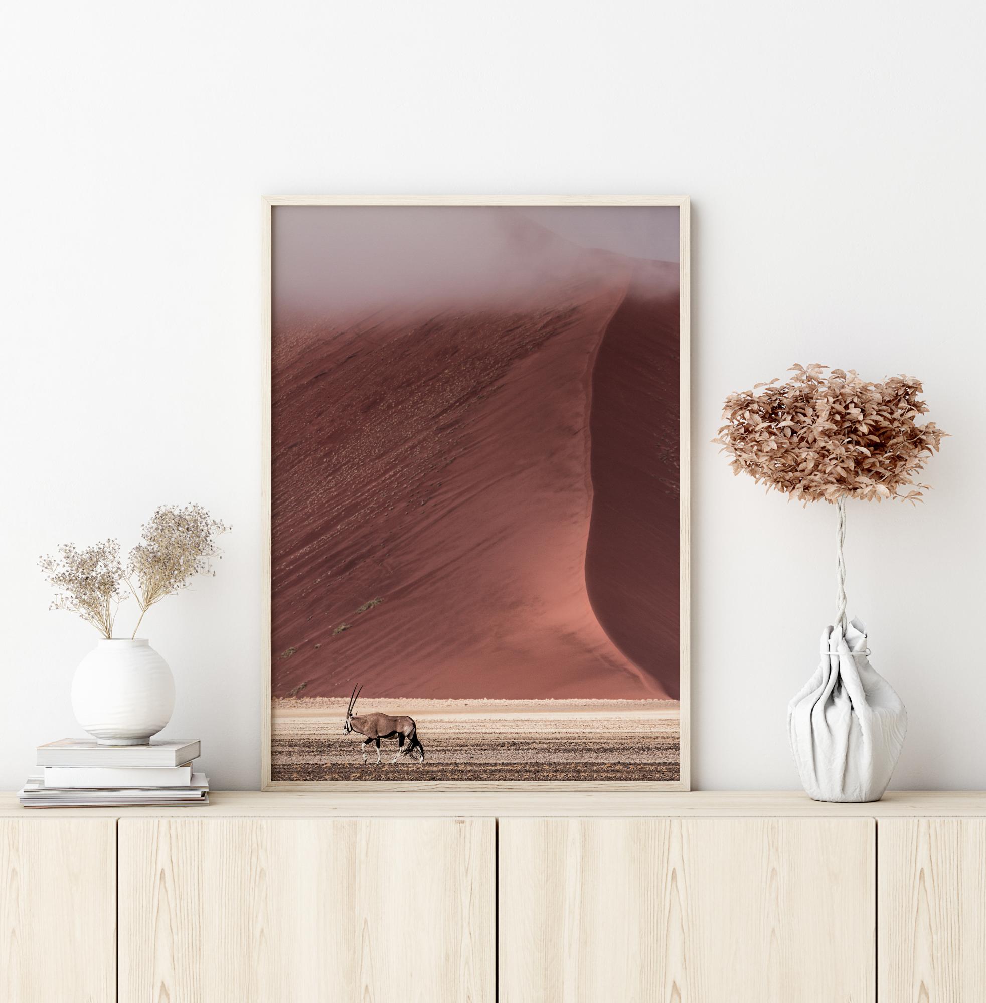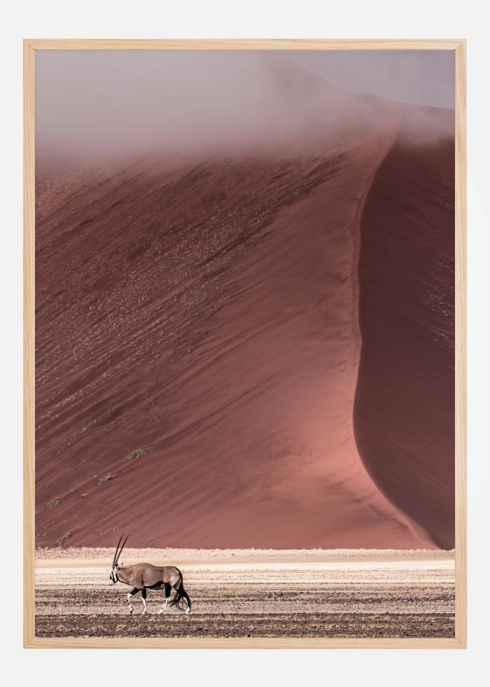 Un poster simplu cu o gazelă obosită care traversează deșertul. În fundal, o dună de nisip roșie impresionantă întâlnește pământul nisipos în partea de jos a imaginii. Culorile frumoase se estompează în ceața deșertului. Pe un fundal crem, aceste culori liniștitoare creează o scenă naturală frumoasă.