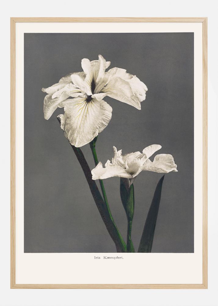 Această posteră elegantă prezintă Iris Kaempferi, cunoscută și sub numele de iris japonez, în nuanțe de aur pal și alb pe un fundal subtil gri, care accentuează calitățile sculpturale ale acestor flori încântătoare. Detaliile structurii florilor sunt frumos evidențiate cu umbre și lumini care joacă pe petale, în timp ce dungi întunecate, aproape negre, în centrul florii adaugă adâncime și dimensiune. O compoziție armonioasă de culoare și formă care recreează frumusețea naturală a acestor flori.