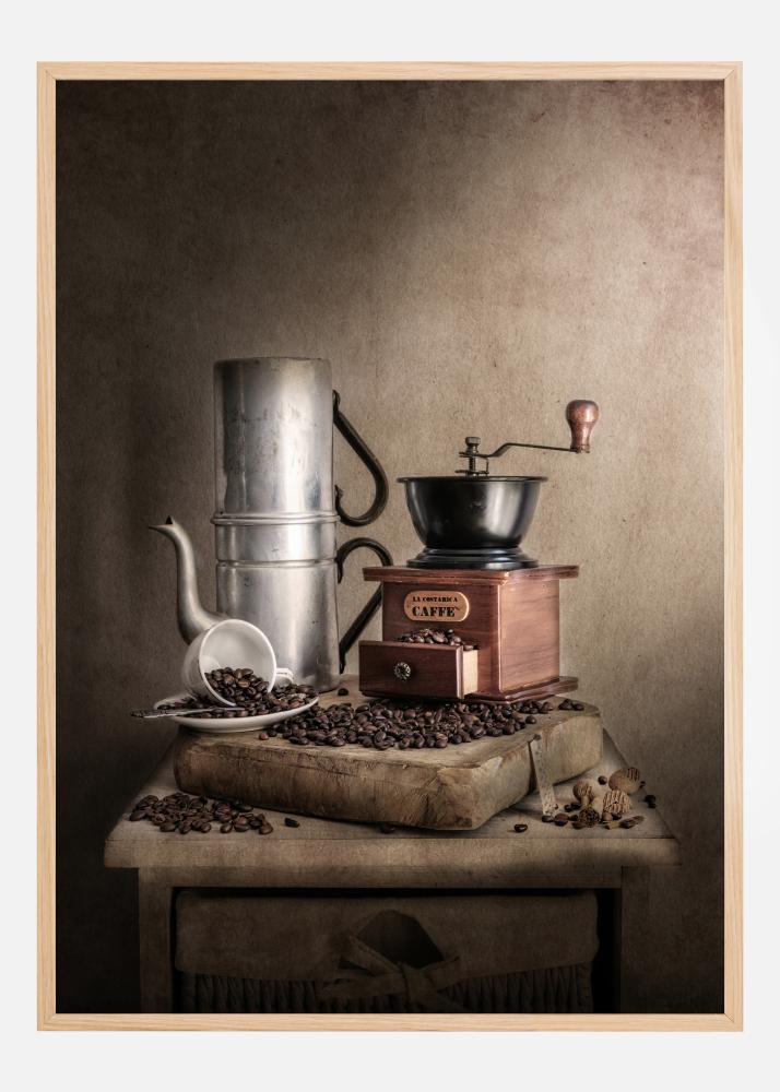 Un poster cu tematică de cafea, cu o râșniță de cafea, o cană de cafea, boabe de cafea, precum și o ceașcă albă și o farfurie. Tonurile calde de maro din acest poster creează o imagine relaxantă în care aproape poți simți mirosul minunatelor boabe de cafea prăjite. Imaginea perfectă de agățat în bucătăria ta.