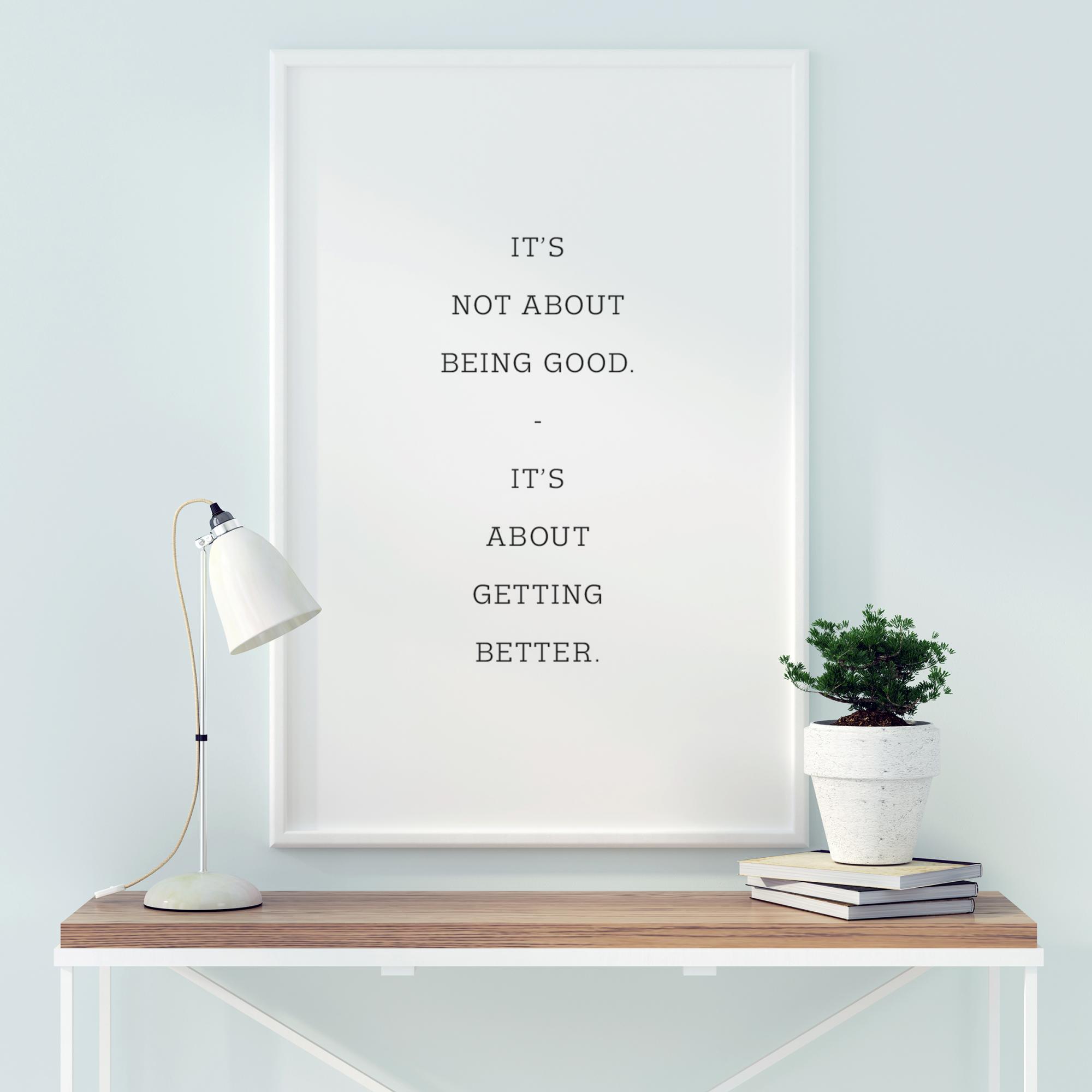 Un poster motivațional alb-negru cu un mesaj simplu dar eficient. Nu este vorba despre a fi bun, ci despre a deveni mai bun. Un mesaj simplu care încurajează cititorul să întâmpine viața calm, cu scopul de a se îmbunătăți în viața de zi cu zi.