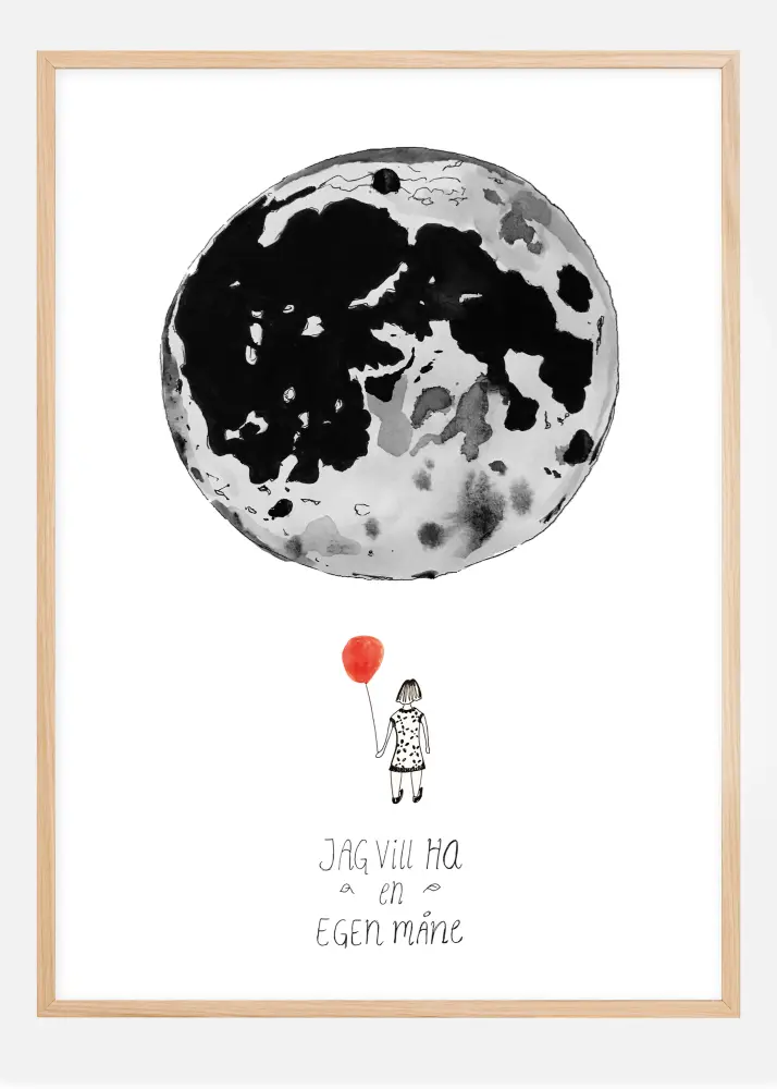 Un afiș simplu alb-negru cu o fetiță care stă sub lume. Ea este îmbrăcată într-o rochie neagră cu pete albe și ține un balon portocaliu. Vreau să am propria lună este mesajul pe care vrea să-l transmită. Un imprimeu perfect de agățat în camera copiilor.