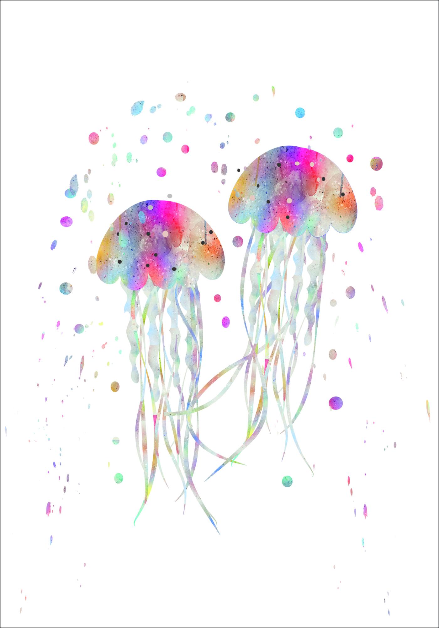 Un imprimeu distractiv și creativ cu două mici meduze multicolore. Cu clopotele și tentaculele lor colorate, sunt înconjurate de puncte colorate aleatorii pe un fundal alb. Un poster fermecător care va lumina orice cameră.