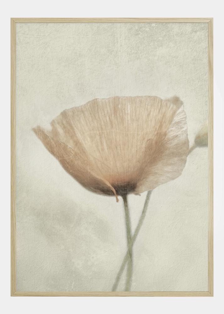 Un poster frumos al naturii cu un singur mac de culoare piersică pe un fundal bej. Cu petalele sale larg deschise, în nuanțe moi, oferă o senzație de calm și liniște. Transparența petalelor dezvăluie interiorul negru al florii. O imagine expresivă care se potrivește de minune pe un perete de culoare pală.