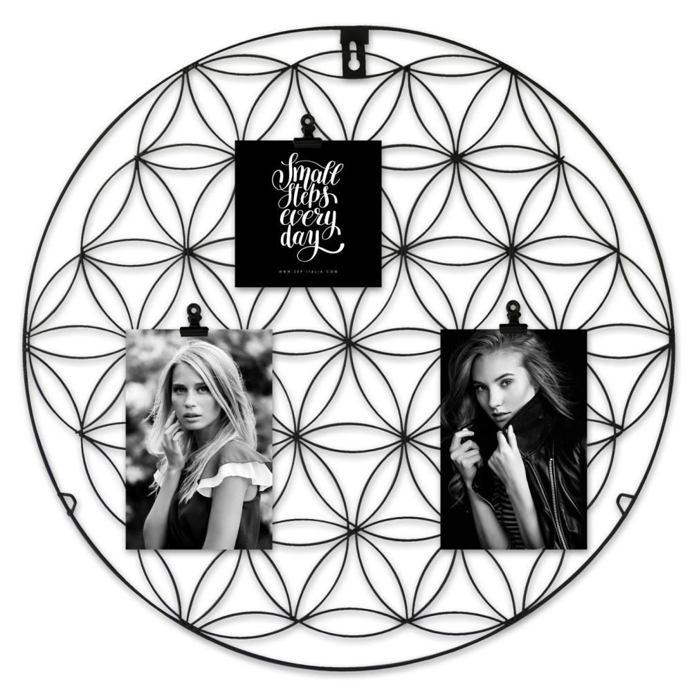 Aceasta este o ramă rotundă și atractivă din metal negru. Rama colaj are un diametru de 50 cm și imaginile sunt fixate cu cleme pe un fundal cu model decorativ. Deoarece fixezi imaginile cu cleme, poți alege să fixezi fotografii de diferite dimensiuni pentru a crea un sentiment stilat și dinamic. Această ramă colaj rotundă din metal poate fi amplasată frumos în casă pentru un punct de atracție frumos sau poate fi oferită cadou cuiva drag!