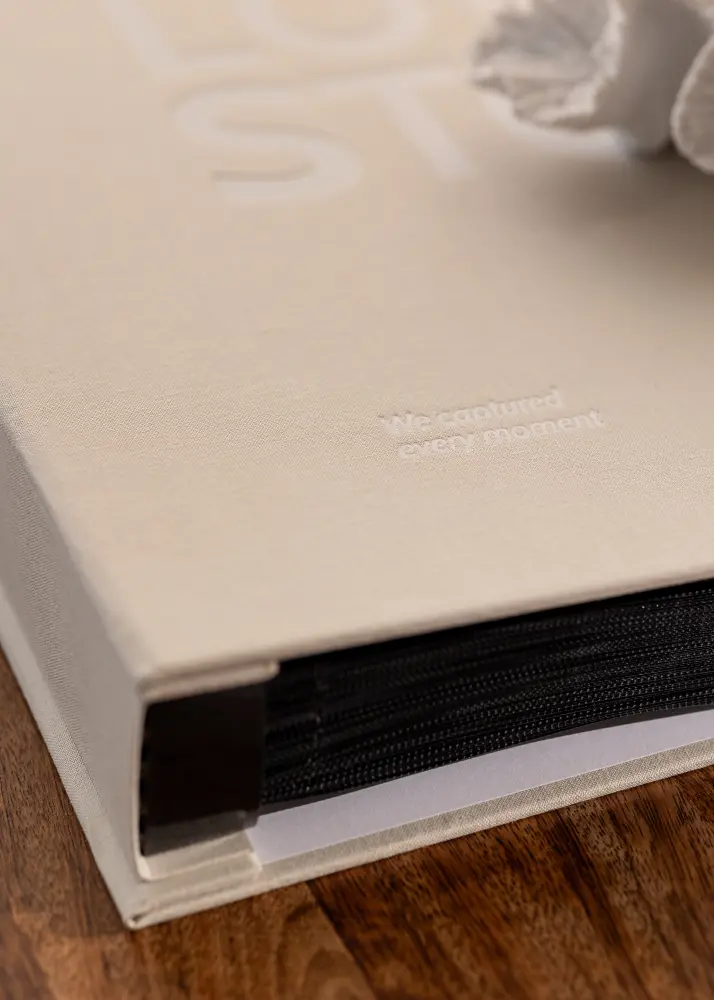Coperțile albumului sunt într-o nuanță de bej simplă care oferă o senzație atemporală și sofisticată. În interiorul albumului găsiți 120 de pagini, echivalentul a 60 de foi, din hârtie neagră de înaltă calitate care evidențiază fotografiile într-un mod elegant. Paginile negre creează un contrast frumos cu coperțile deschise și oferă o notă exclusivistă întregului album.