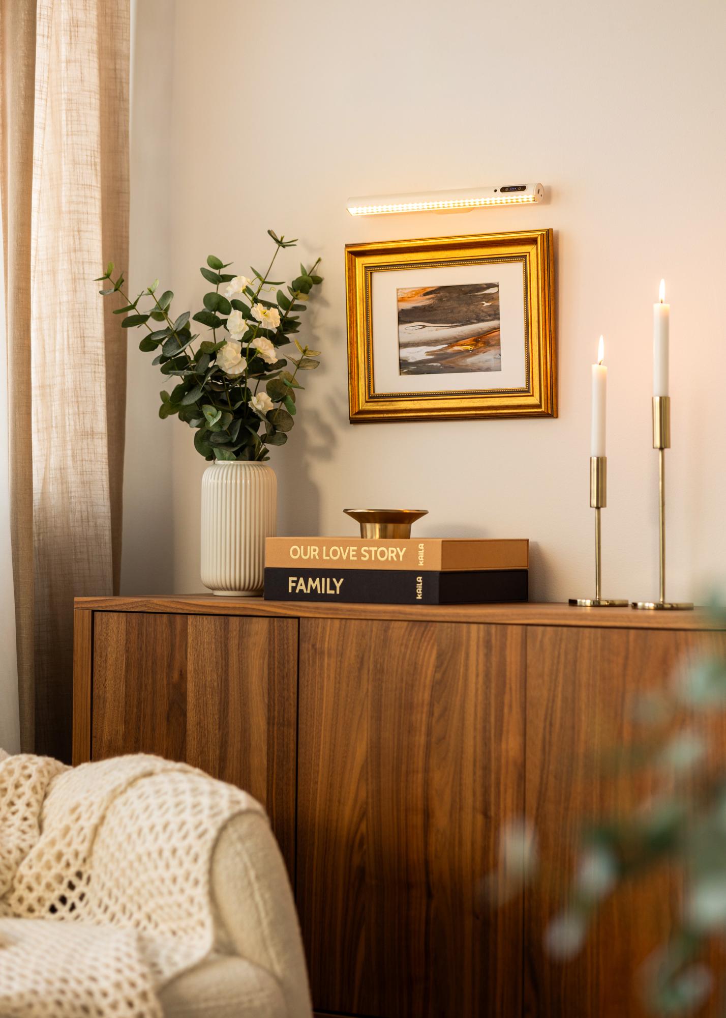 KAILA Illuminate este un iluminat elegant și alimentat cu baterii pentru tablouri, cu finisaj alb, perfect pentru a evidenția tablourile tale fără fire deranjante. Designul fără fir face ca montarea să fie simplă și flexibilă, fără a trebui să te gândești la prize electrice. Culoarea albă elegantă oferă o expresie modernă și discretă care se integrează în diferite stiluri de decor, în timp ce lumina uniformă evidențiază detaliile și culorile artei tale. Ușor de instalat și de utilizat – o soluție practică și comodă pentru arta ta de perete.
