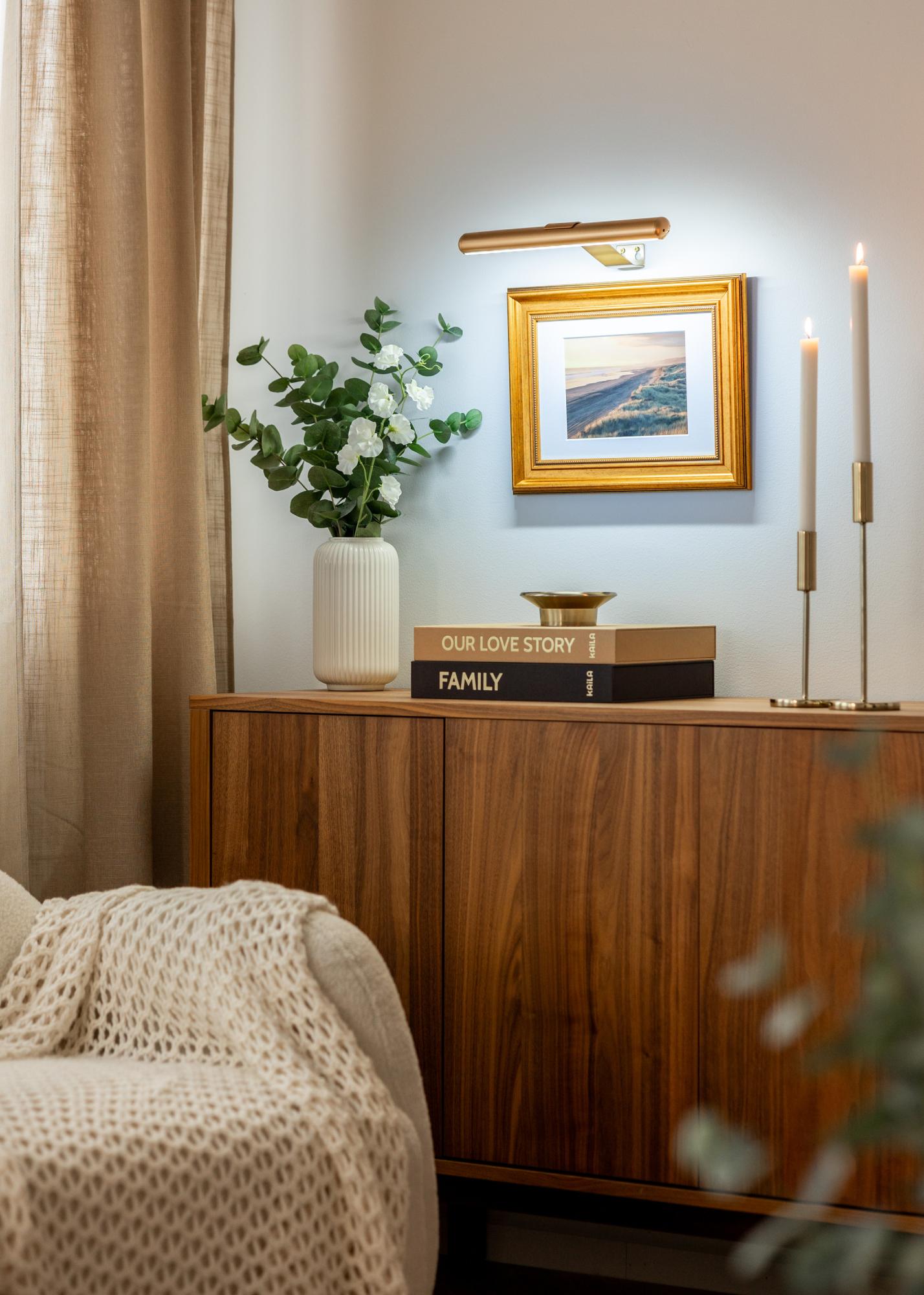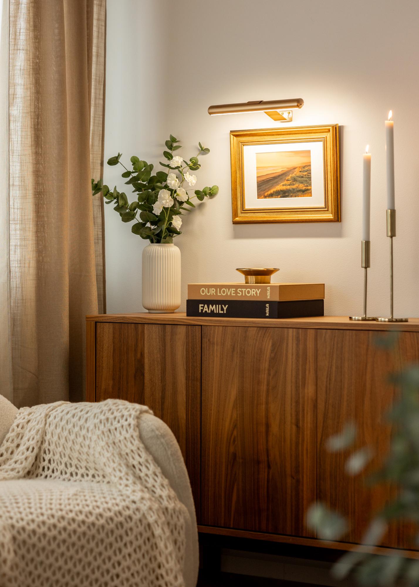 Această iluminare pentru tablouri cu baterii, cu un aspect elegant de aur, oferă o soluție stilată și flexibilă pentru a ilumina operele de artă fără a avea nevoie de cabluri vizibile. Unicitatea iluminării pentru tablouri cu baterii este că o poți plasa cu ușurință exact acolo unde este necesară, fără a trebui să te gândești la apropierea de o priză electrică. Cu o lungime de 33 cm și o adâncime de 15 cm, se potrivește perfect pentru a ilumina operele de artă cu o lățime de până la 60 cm.